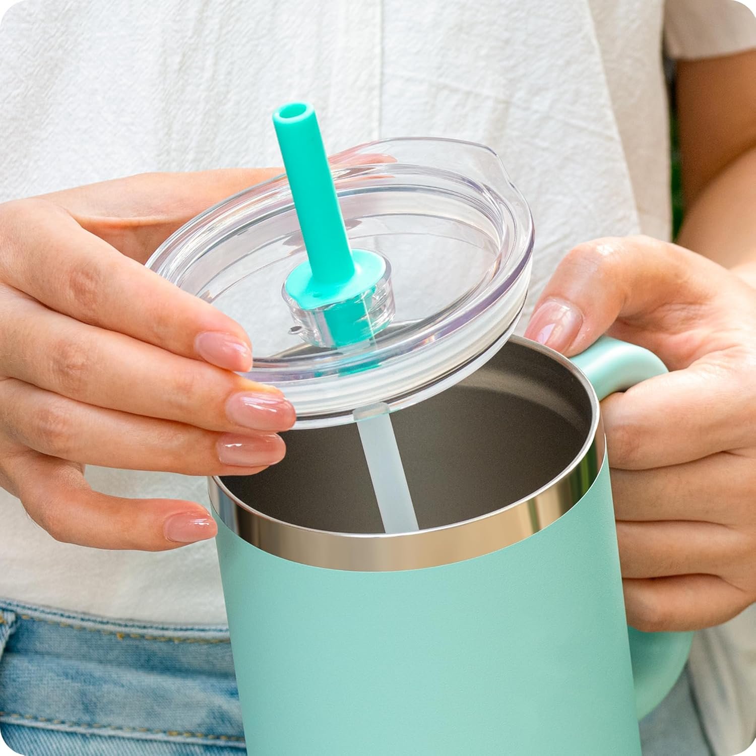 【Upgraded Drinking Experience】Transparent lid makes it easy to check the remaining beverage status at any time, increasing convenience. Soft silicone suction nozzle fits snugly against the lips, providing comfortable drinking