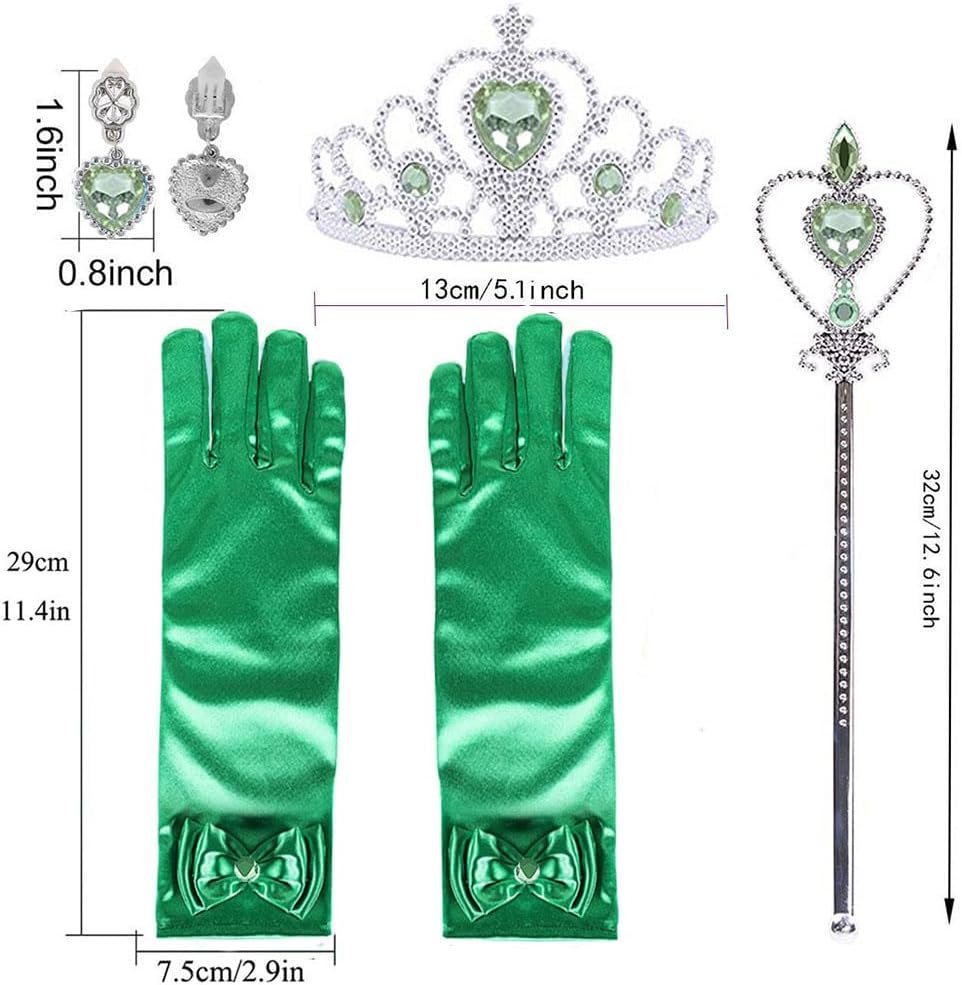 A SET INCLUDING — Tiana Dress and Accessories Set, complete with pretty crown, magic wand, necklace, ring, ear clip, and gloves. Gorgeous Tiana dress for girls, best gift for birthday or Halloween.