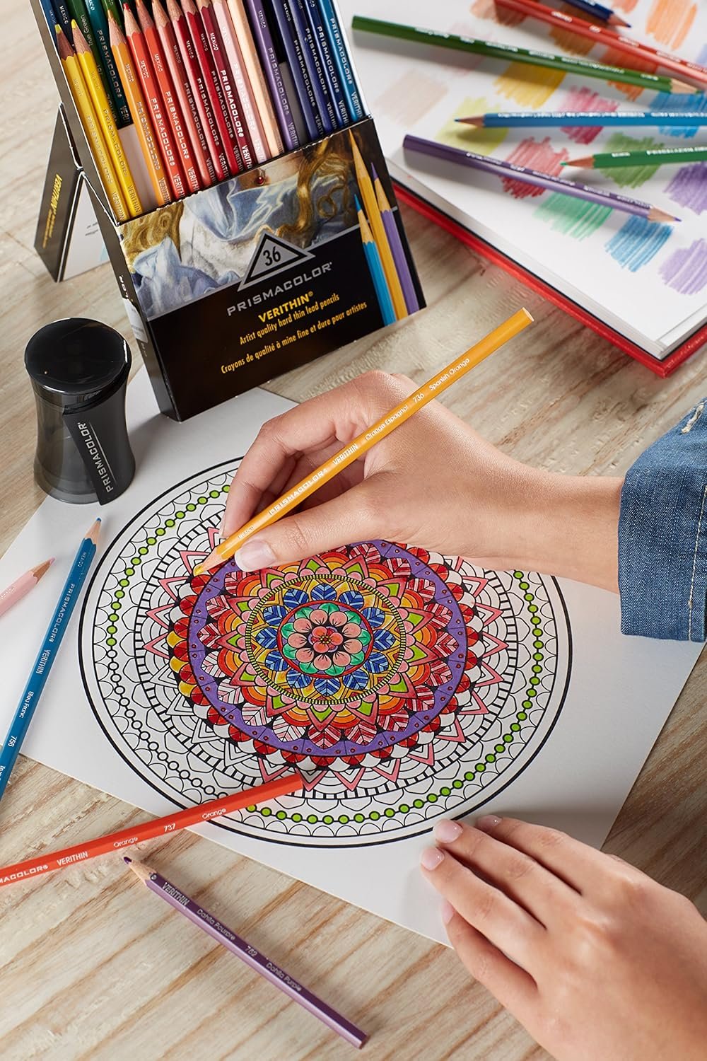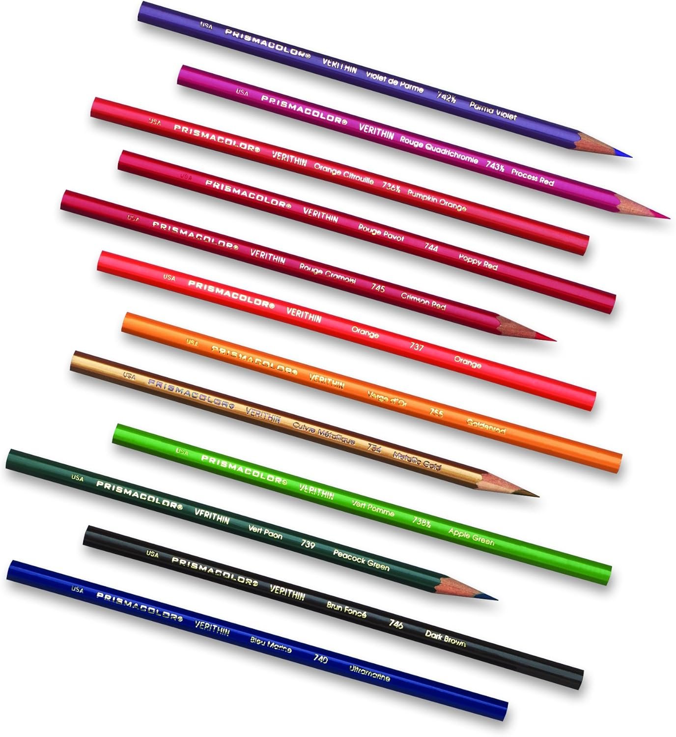 Draw razor sharp details, intricate lines and create refined edges with Prismacolor Premier Verithin Colored Pencils. The 36 colored pencils feature thin, ultra-hard cores that sharpen to a precise point all while resisting crumbling and cracking. This blend of durability and precision makes Prismacolor Verithin pencils the artist’s choice for detailing and lettering. Prismacolor art pencils also have pigments of unmatched quality and richness.