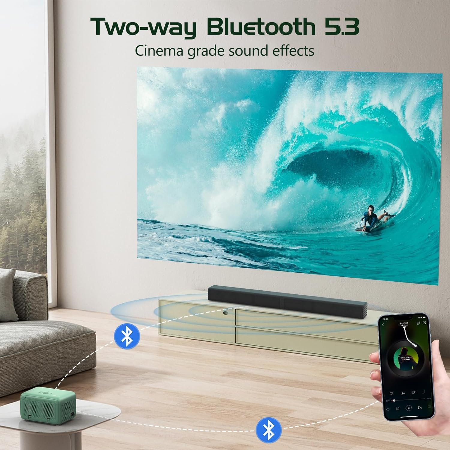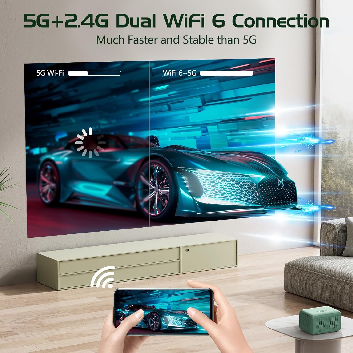 【Projector with WiFi 6 and Bluetooth 5.2】Compared with 2.4G /5G WiFi, this projector adopts the latest and fastest WiFi 6 technology, providing more stable transmission and higher reliability for your entertainment needs. The two-way Bluetooth design not only enables you to connect external speakers or wireless headphones for cinema-quality surround sound, but also allows you to connect your mobile phone as a speaker via Bluetooth! One important limitation to note is that you cannot mirror your phone screen via Bluetooth. Bluetooth is used only for audio transmission, so screen mirroring must be done via Wi-Fi or a wired connection.