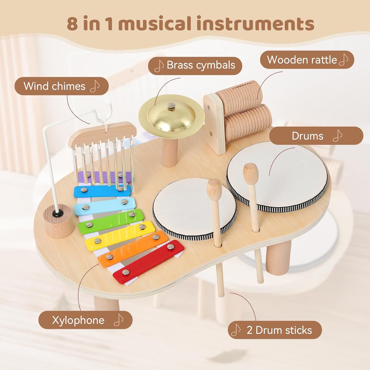 All-in-One Musical Adventure Center: Unleash a symphony of fun! The musical instruments for toddlers features various instruments, including xylophone, wind chime, brass cymbals, wooden rattle and 2 drums, all could mounted on a durable wooden platform.No more scattered toys! The integrated design keeps the play area tidy and invites toddlers to explore rhythm, compare sounds, and become the conductor of their own orchestra from one engaging center.