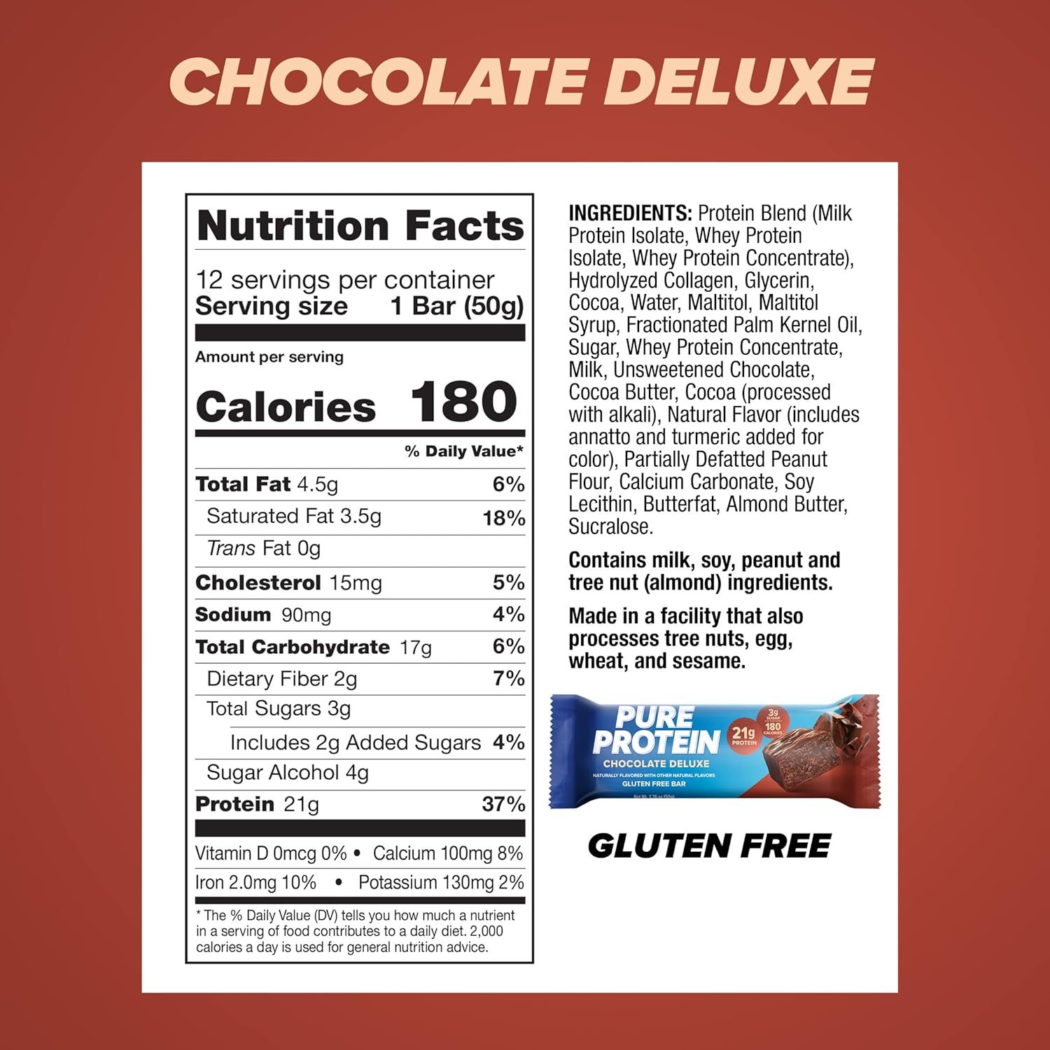 Pure Protein Chocolate Deluxe Protein Bars – 20g Protein, 3g Sugar, 190 Calories (12 count) Low Sugar* High Protein Snack – Gluten Free – Perfect for a Healthy Snack