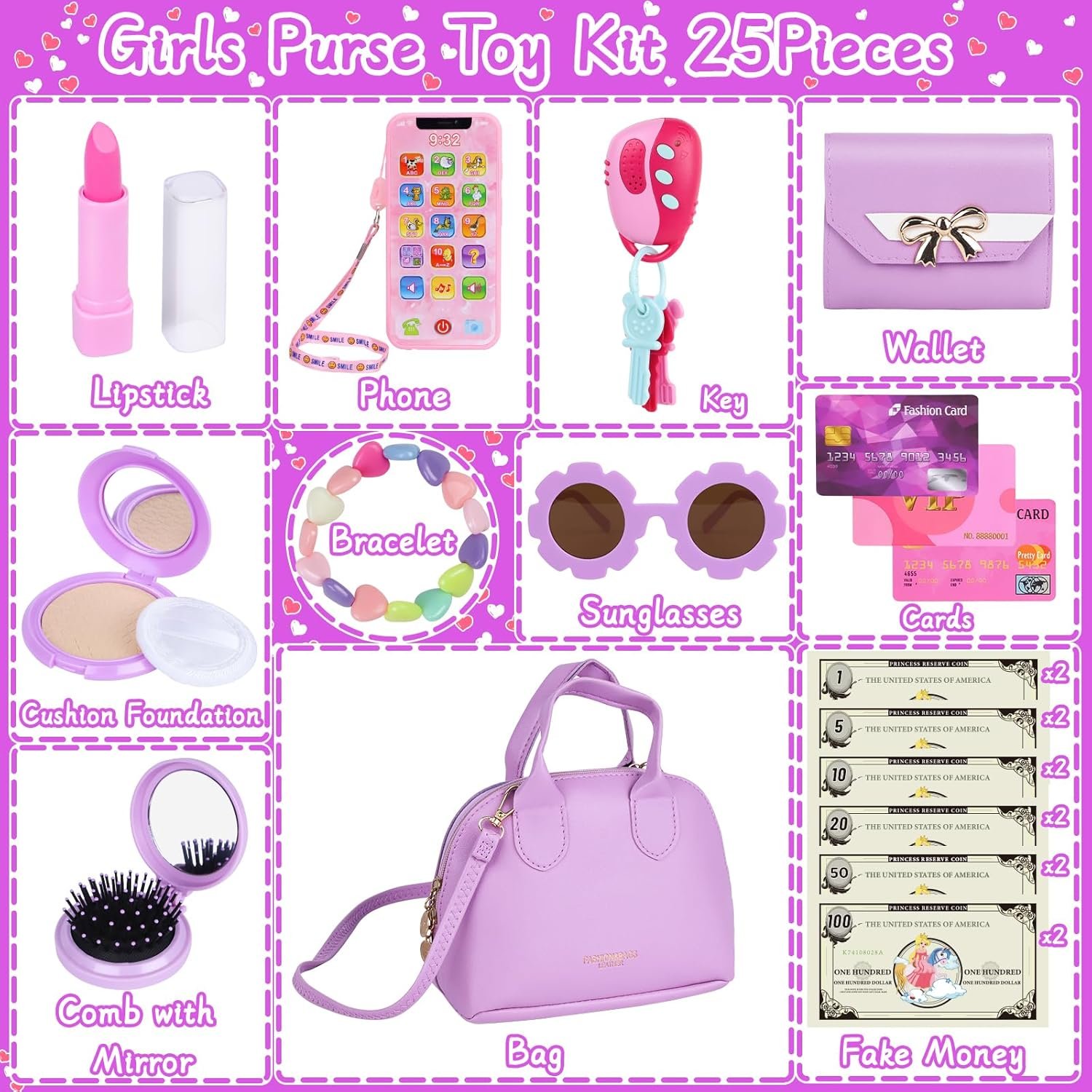 My First Princess Purse Kit – Girls like princess toys and imitate their mothers. A complete set of Kids Makeup Kit Purse for little girls is everything toddler girls want! Including Purse Bag x1, Wallet x1, Sunglasses x1, Kids Play Phone x1, Play Car Keys x1, Cards x3, Fake Money x12 (1$, 5$, 10$, 20$, 50$, 100$, each x2 ), Comb with Mirror x1, Bracelet x1, Lipstick x1, Cushion Foundation x1, Powder Puff x1. Total: 25 Pieces.
