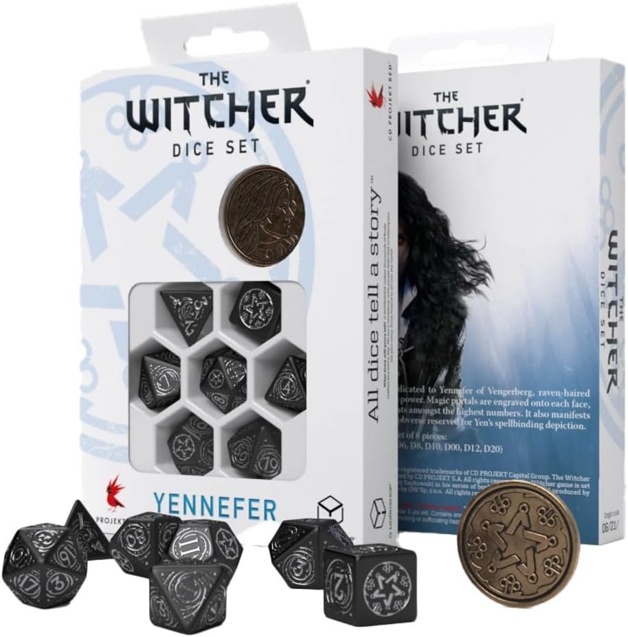 Witcher Dice Set. Yennefer – The Obsidian Star Focus on the star. Inspired by The Witcher franchise, this dice set is dedicated to Yennefer of Vengerberg — the raven-haired bearer of the Obsidian Star. The set contains 8 pieces; 7 polyhedral dice, and a metal coin featuring Yennefer’s depiction, which acts as a D2. Each die is painted black with silver engravings. The highest value faces and coin reverse share imagery with Yen’s pendant. The Witcher Dice Set is officially licensed by CD PROJEKT RED.