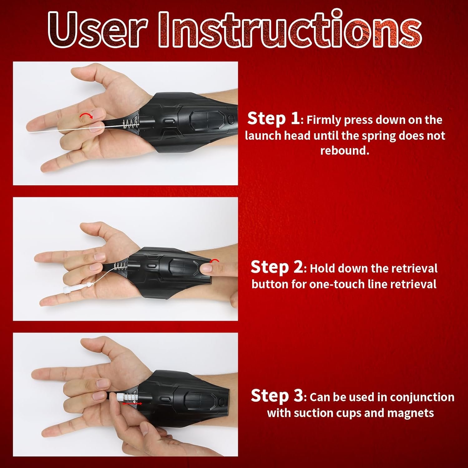 Easy To Operate: The web shooters come with a built-in rechargeable battery and motor. Simply press the reel switch gently for approximately 4 seconds, then press the spring for the next shot. The firing effective distance is 8 feet. (Please refer to the manual before use!)