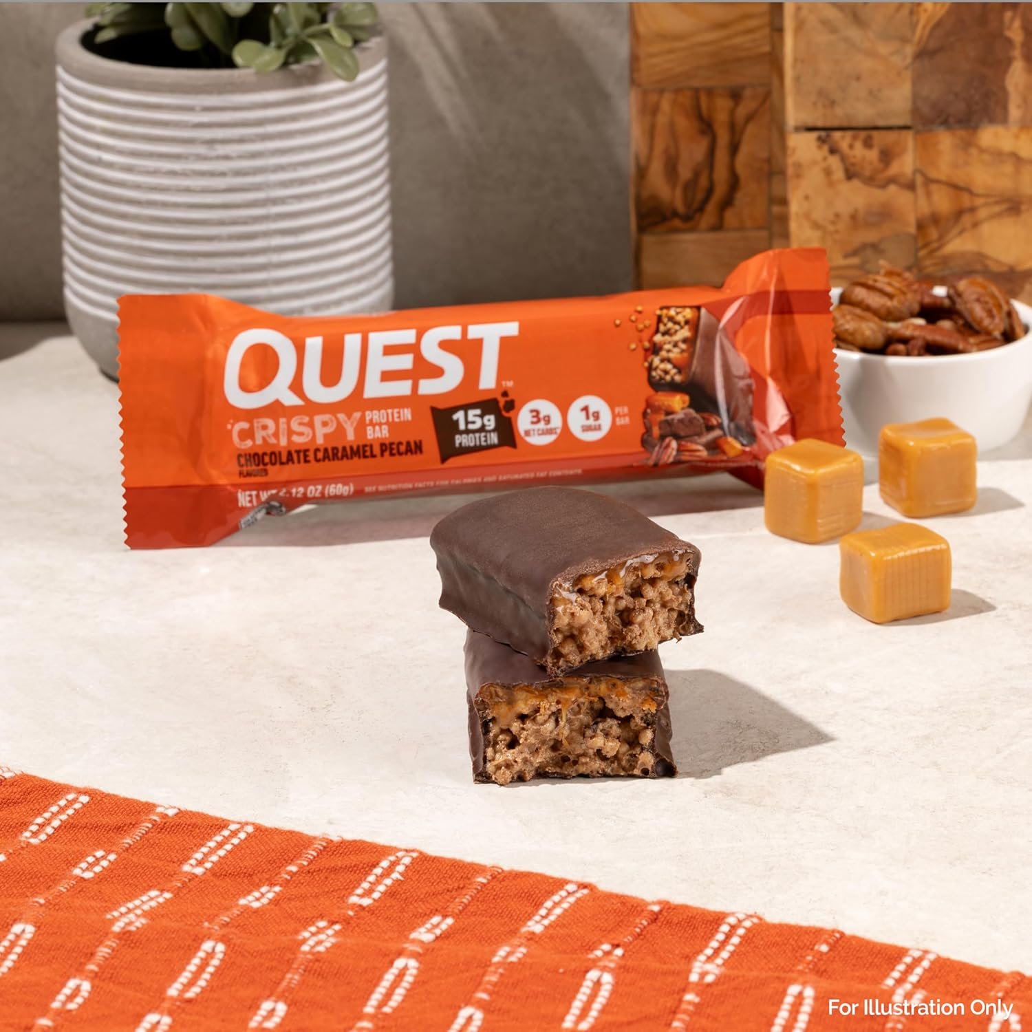 AT HOME OR ON-THE-GO. Quest Chocolate Caramel Pecan Flavored Crispy Protein Bars with 15g of grab & go protein* are great for your morning commute, as a tasty treat at your desk, or a delicious way to refuel after a workout