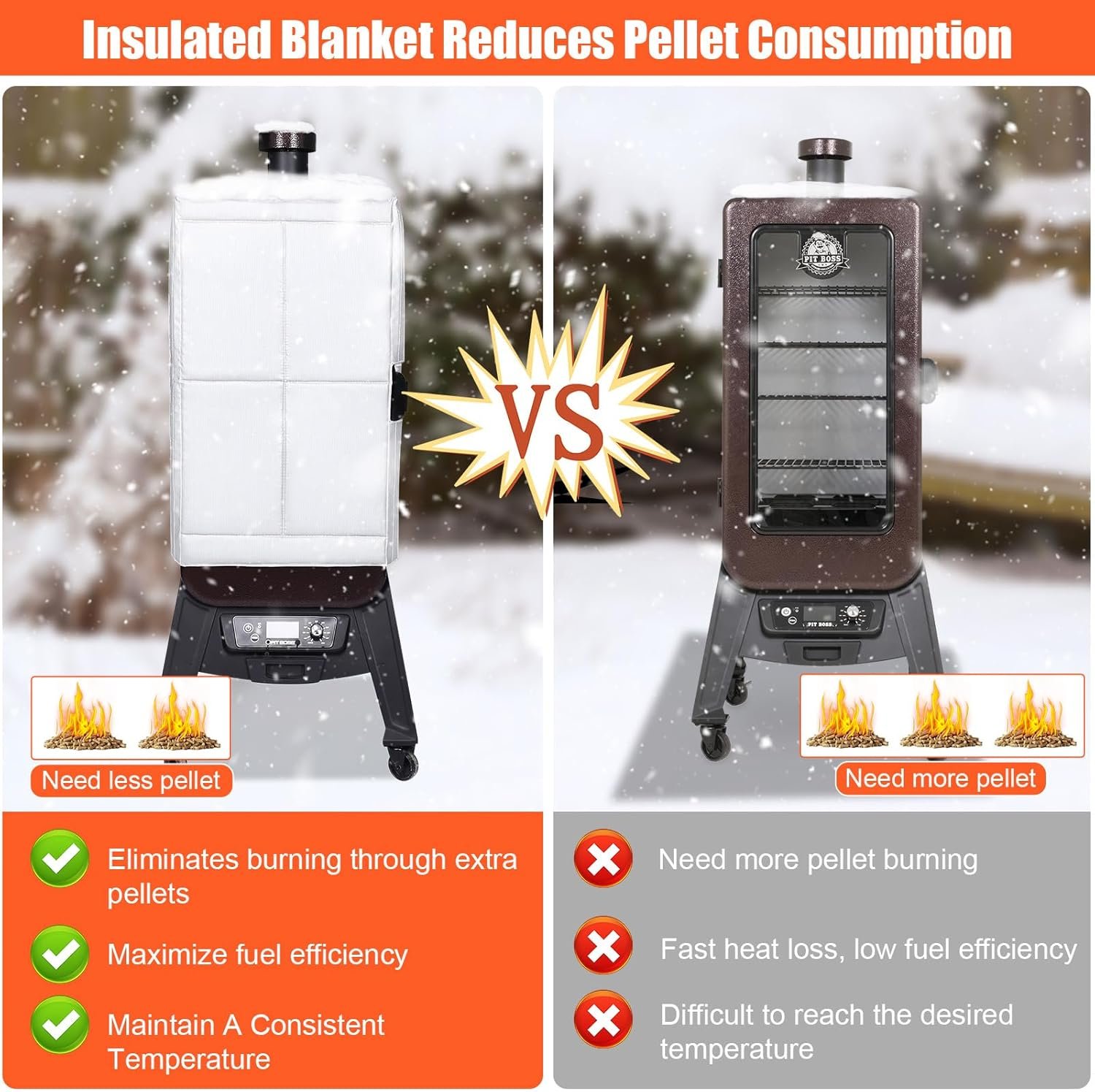Saves pellets and enables better temperature regulation. It greatly reduces pellet consumption by maintaining temperature during cooks in cold environments.​