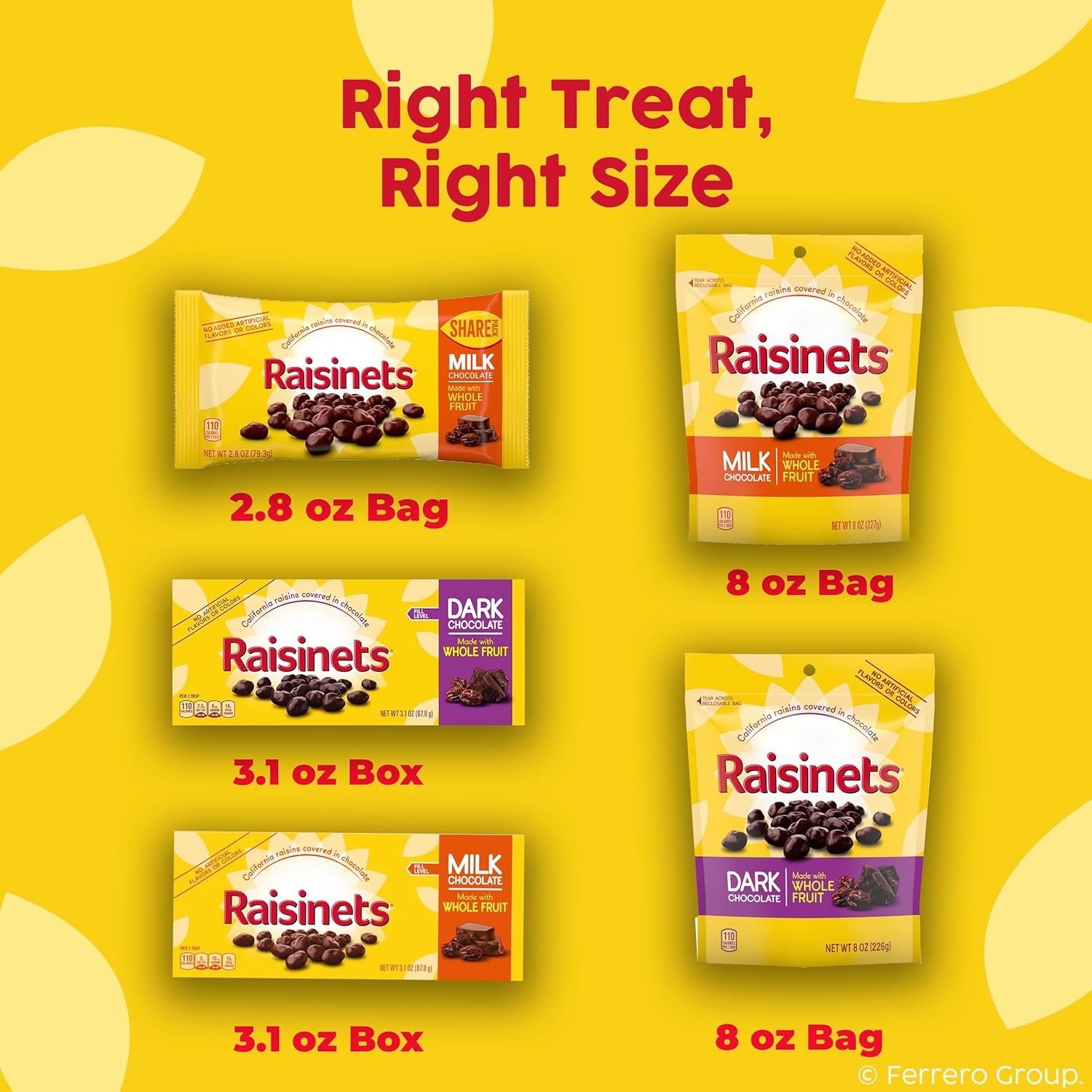 PERFECT ANYTIME: Enjoy these bite-sized chocolate covered raisins anytime. Whether you’re at home, at work, or on the go, Raisinets are the perfect sweet treat.