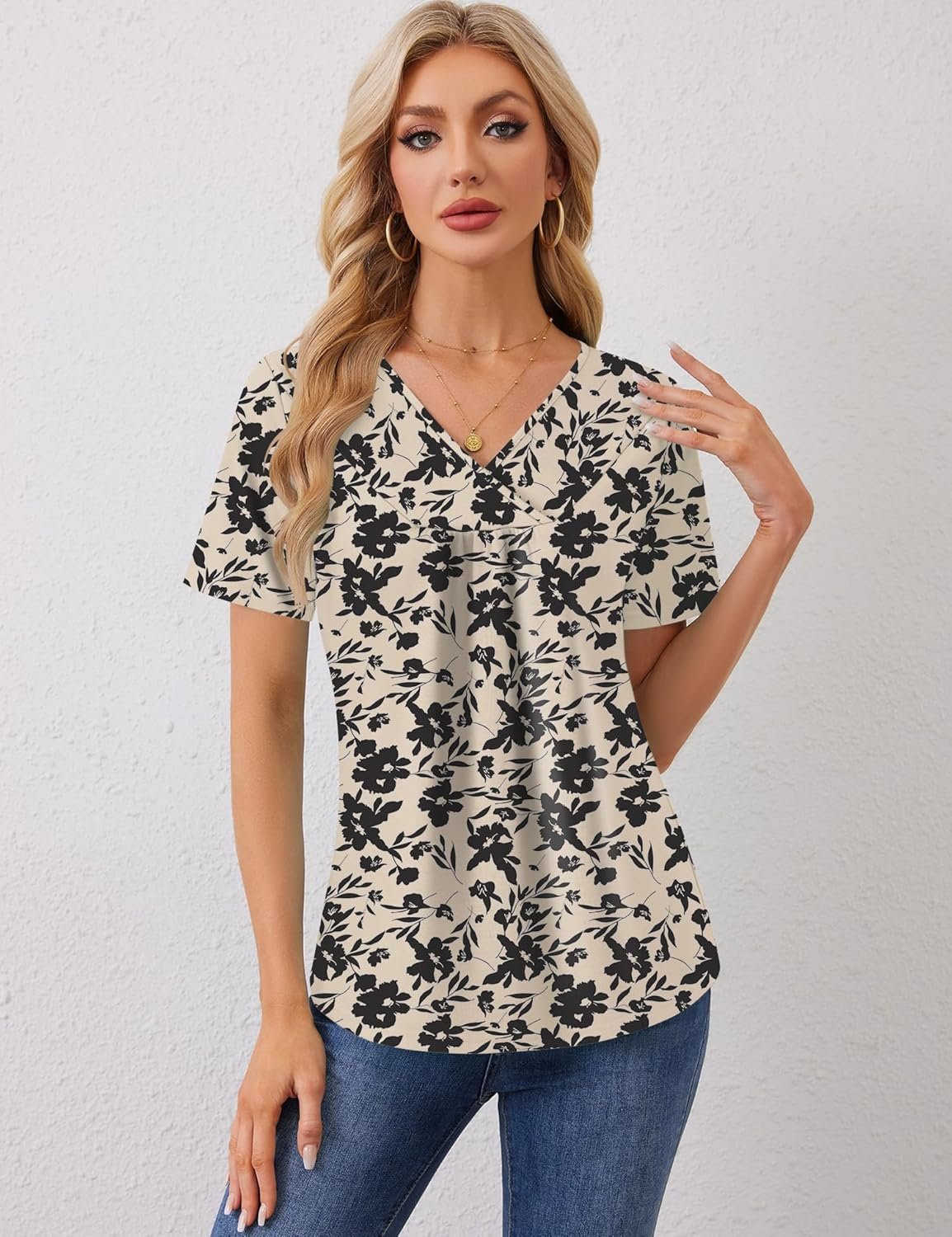 Rapbin Womens Short Sleeve Tunic Tops Dressy V Neck T Shirts Pleated Blouses