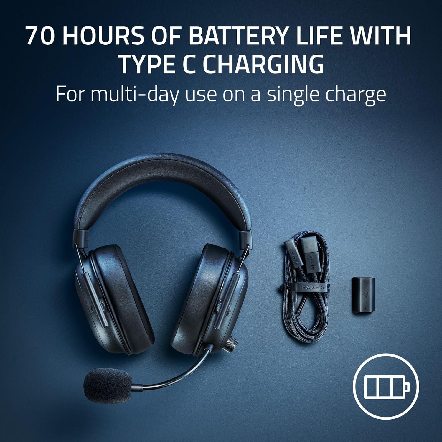 70 HOURS OF BATTERY LIFE plus TYPE C CHARGING — A single full charge of the headset provides up to 70 hours of battery life