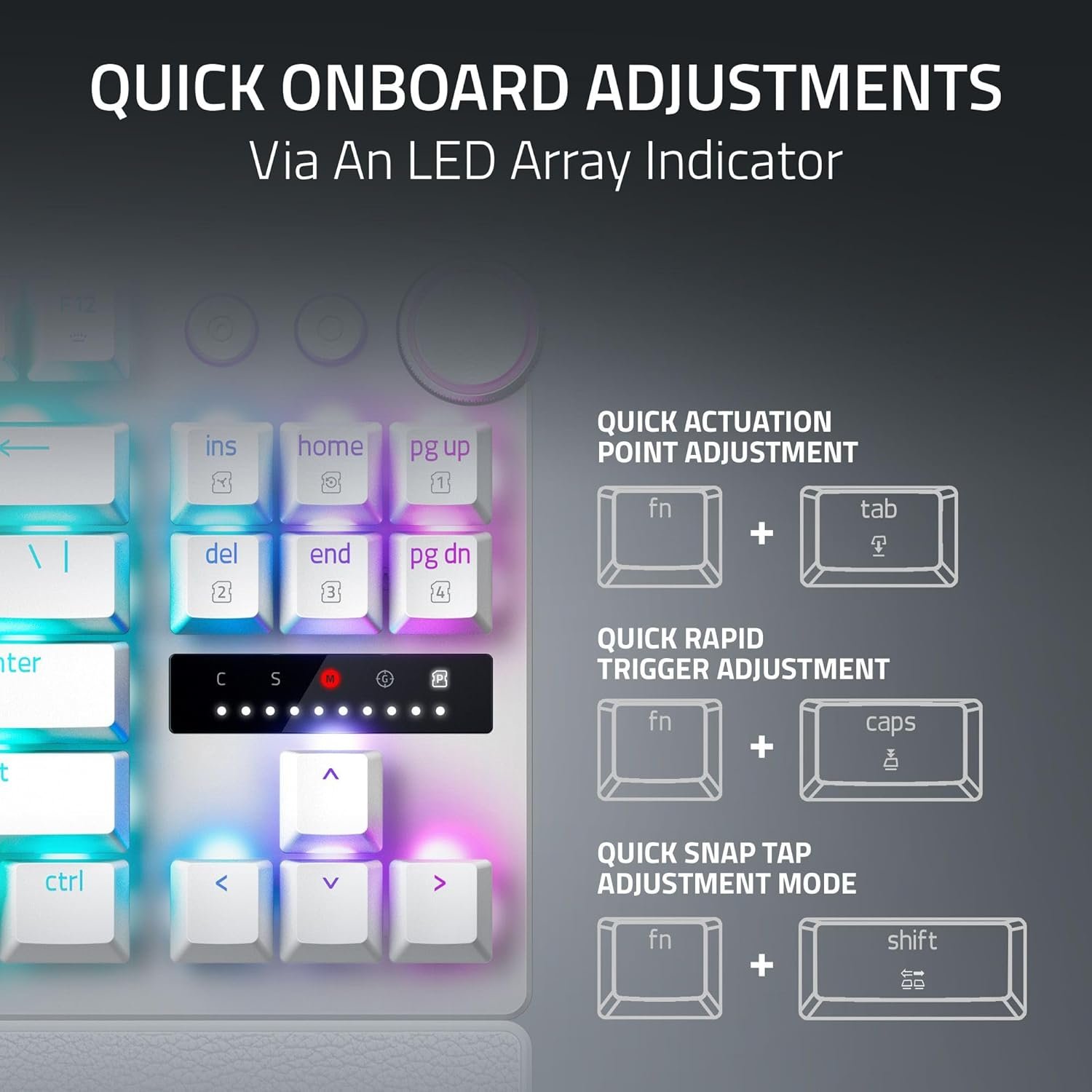 QUICK ONBOARD ADJUSTMENTS — Make precise, on-the-fly adjustments to actuation height or Rapid Trigger sensitivity with the visual aid of an onboard LED array; save the settings to the keyboard with no software required