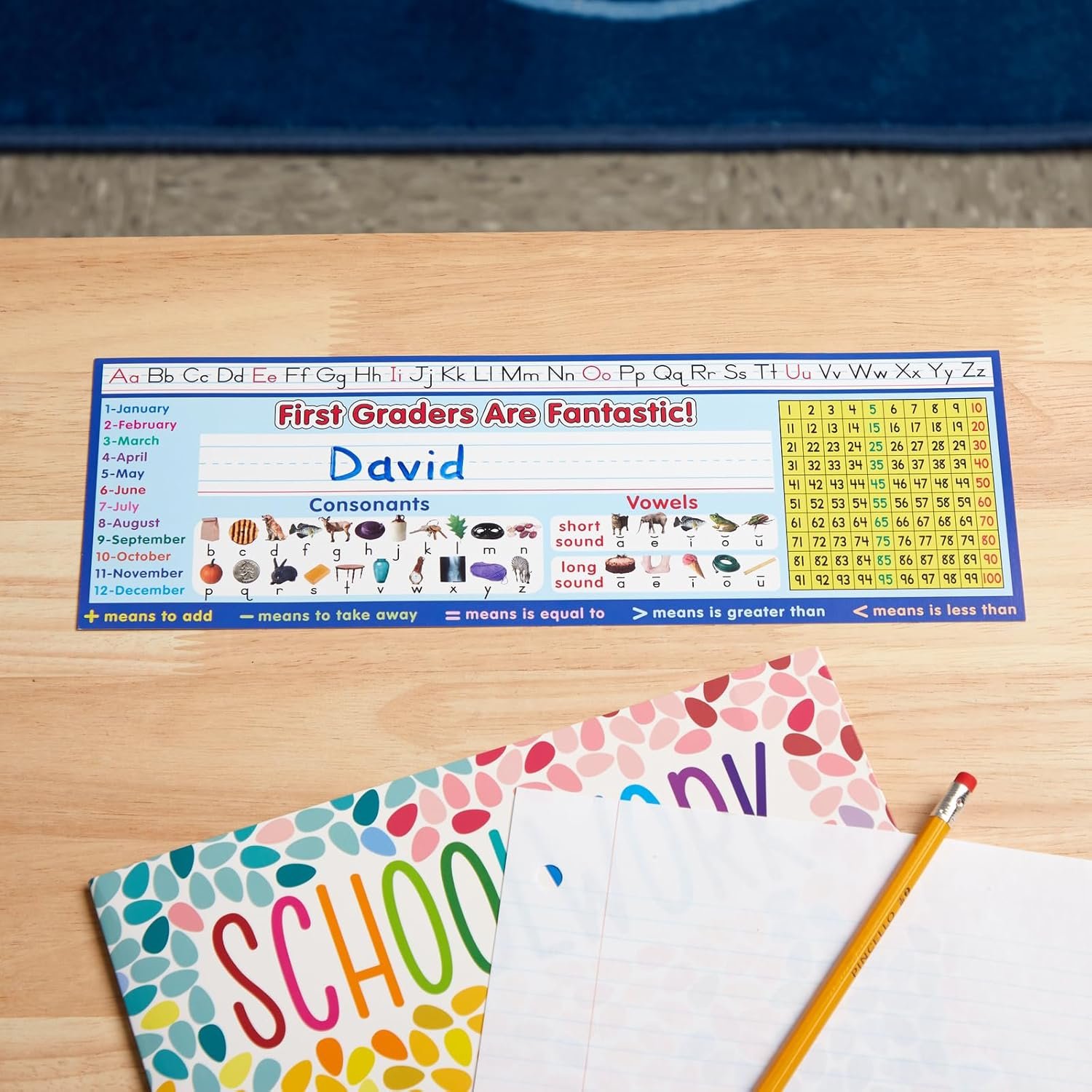 Put Curricular Content Where Students Can Access It Easily – On Their Desktops! Give your first graders the relevant information they need with these two-in-one cardstock helpers. Complete with testing inserts that feature encouraging phrases to conceal the information during a test without having to remove the helpers off the desk. Pair with our self-adhesive sleeves for an unstoppable combination. Made of strong thick cardstock, we have the most durable desktop reference name tags on the market! When paired with our self-adhesive sleeves they easily peel and stick onto any surface. Measuring at 12” by 4” each, these are the perfect size for any classroom. A great tool for your first graders to practice critical thinking, writing and math skills all in one place! This reference name tag features standards-based information on both sides that is valuable for the first grade-level.