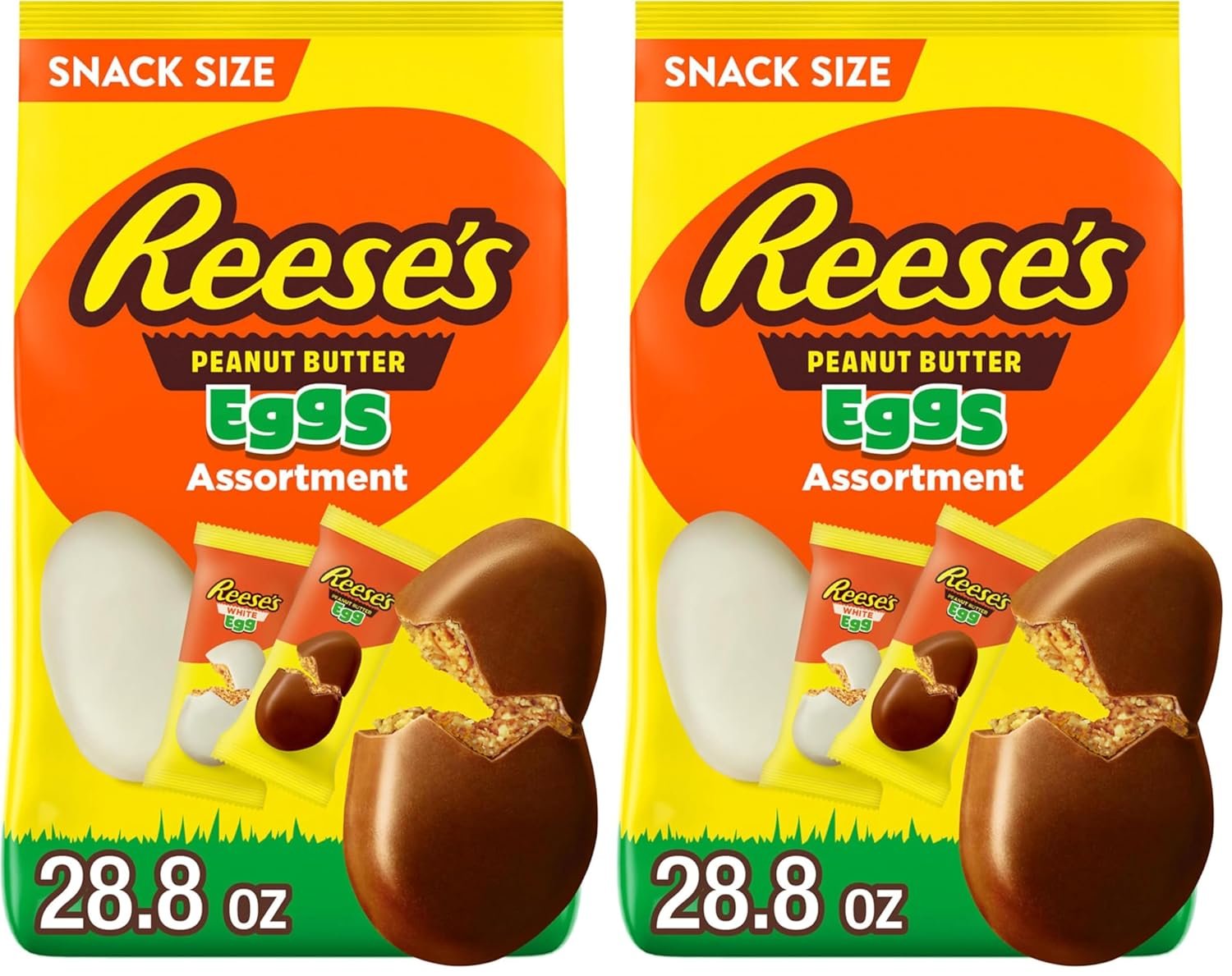 Includes REESE’S Milk Chocolate Snack Size Peanut Butter Eggs and REESE’S White Creme Snack Size Peanut Butter Eggs