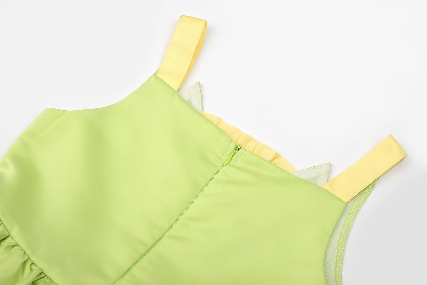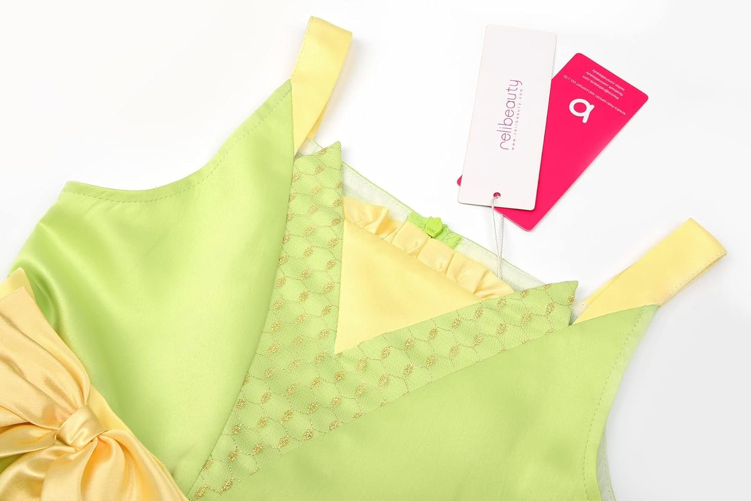 A luxurious satin bow shimmers vibrantly, enhancing the dress’s fairy-tale colors with every movement.