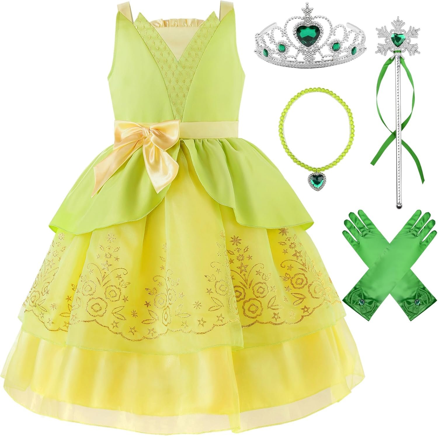 Lime green fairy tale fabric dazzles with intricate golden stitching, meticulously crafted to create royal-worthy elegance.