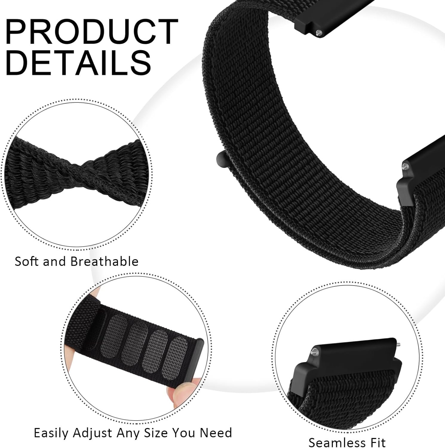 【Soft and Breathable bands】 Made of woven nylon materials, soft, breathable, lightweight and comfortable to wear. Stylish design with solo loop sport Nylon strap offer a better wearing experience