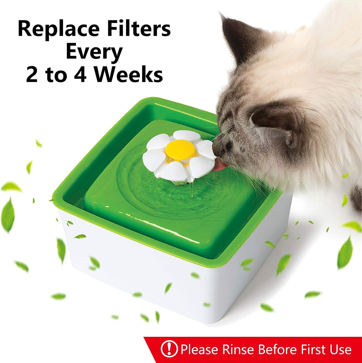 Rinse out filters with running water before inserting in to the fountain. Although completely harmless, doing this will cleanse the filter of any charcoal dust that may have become loose.It is recommended the filter be replaced every 2 to 4 week and more frequently if multiple pets are using the fountain.