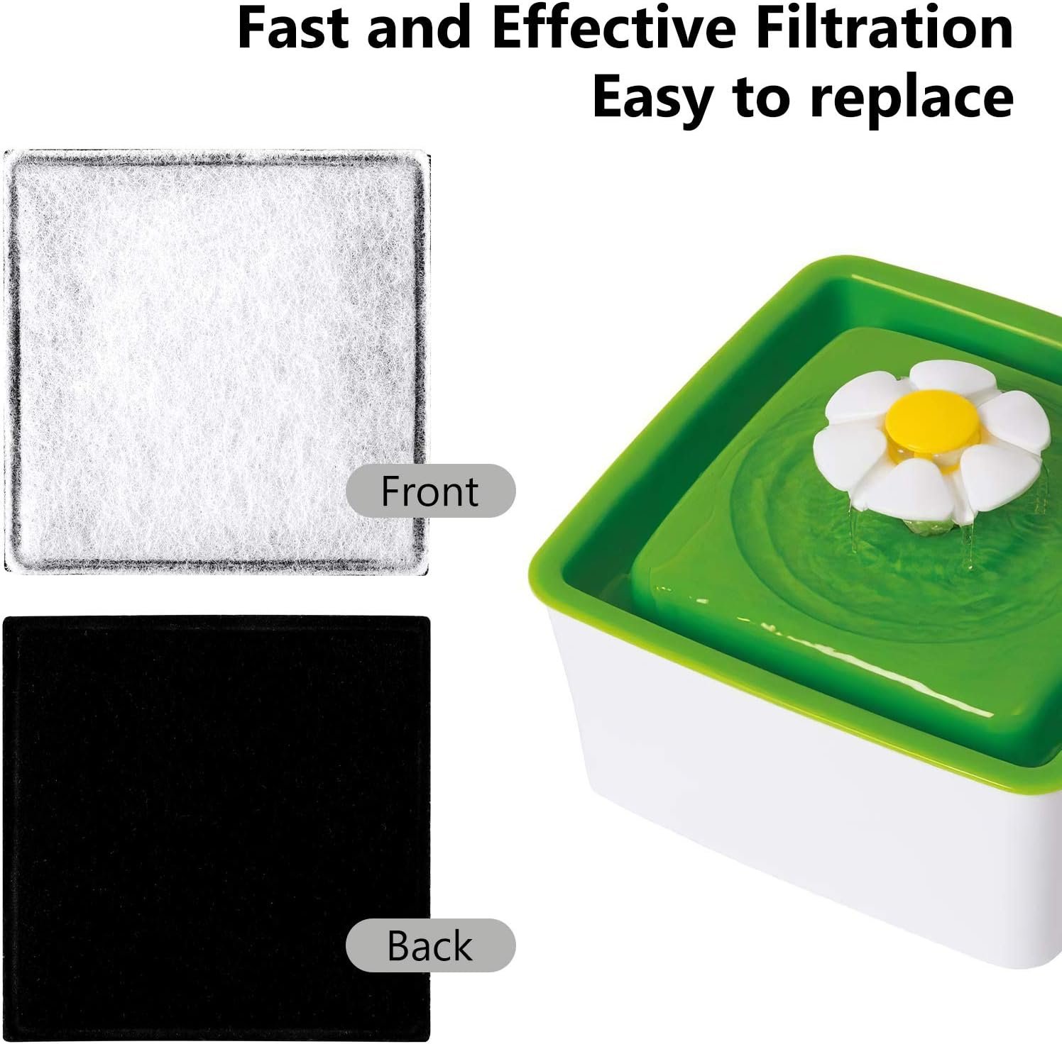 Made from high quality activated carbon and PP cotton, the pet fountain replacement filters can effectively filter dirty and harmful substances in the water so that pets can drink clean and fresh water all day.