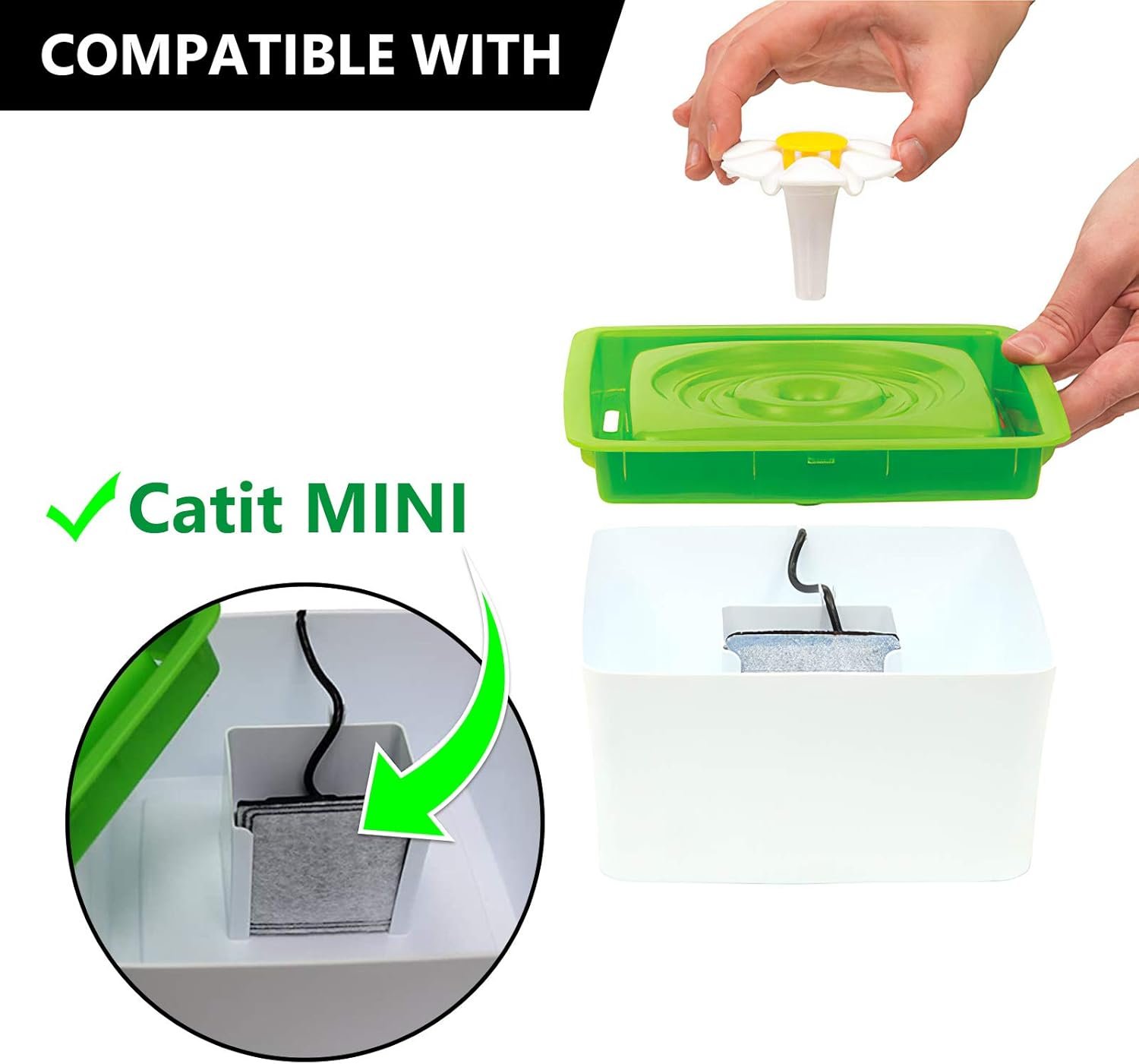 Compatible with catit mini flower fountain Compatible with Aookupett, Compatible with LEXVSS cat water dispenser and other pet water fountain that use the same size Compatible with 100oz/3L Pet Fountain Compatible with Premier Pet Fountain;Compatible with Petsafe Aqua Fountain Aqua Cube, Aqua Falls & Current Fountain Compatible with your Pioneer Pet Ceramic & Compatible with Stainless Steel Raindrop Fountains. Compatible with catit mini flower fountain