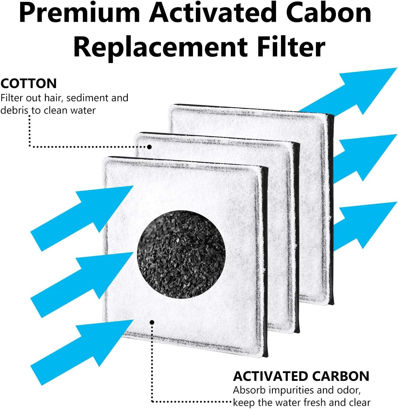 Premium charcoal filters provide clean, fresh water to your pet.Replacement Carbon Filters keep your pet’s water tasting clean and fresh, Safer and healthier.Each filter features Duo-density Polyester Pad to capture hair and debris, Activated Carbon Impregnated Pad to remove odors and eliminates bad taste, Granulated Carbon to extend action.Water is drawn through the charcoal filter, which is segmented into 2 compartments to facilitate filtration and reduce the settling of the charcoal within the filter.Effective carbon filters help extend the life of your fountain and pump, keeping water fresh and improving taste.