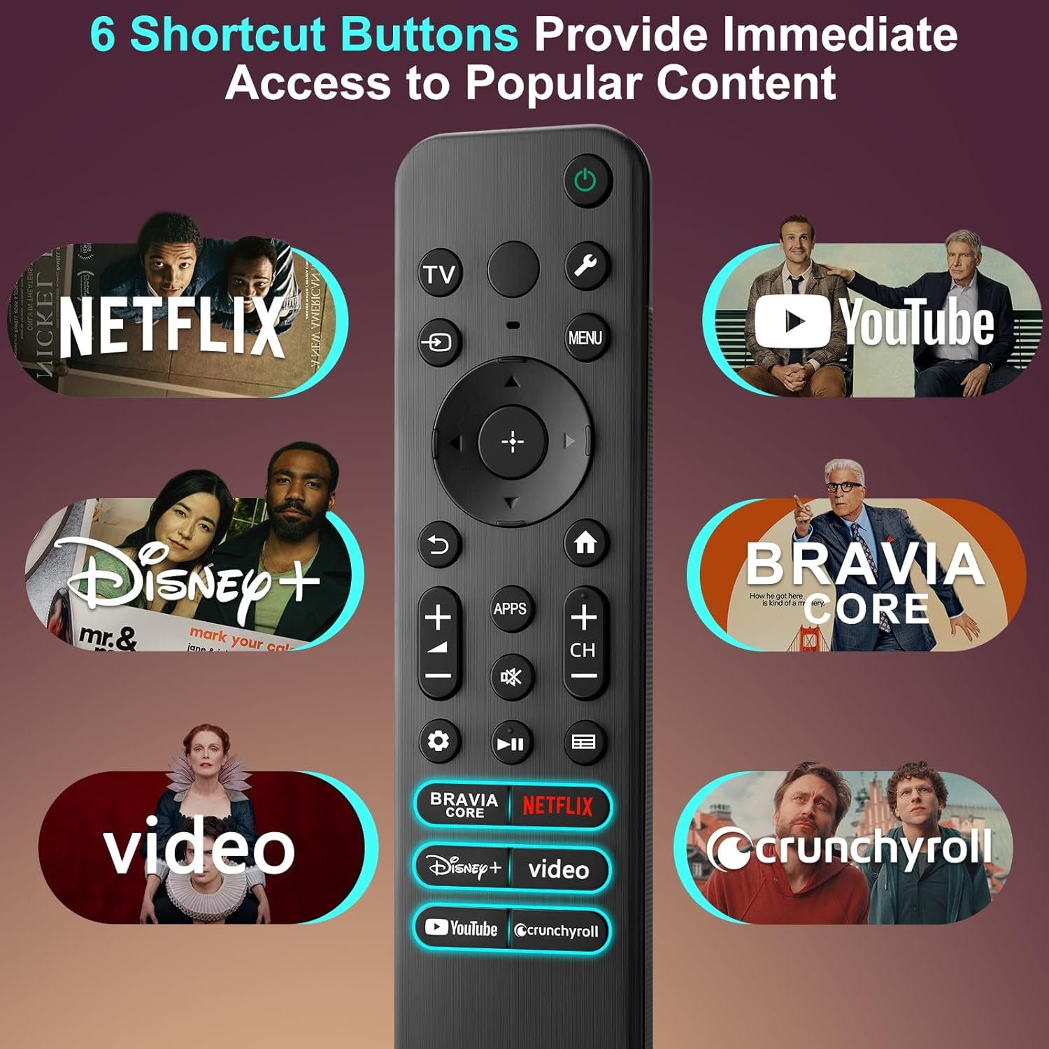 Convenient Shortcut Keys This universal remote features 6 handy shortcut buttons for quick access to your favorite streaming platforms, including BRAVIA CORE, Netflix, Disney+, Video, YouTube, and Crunchyroll. No more navigating through menus—just one-touch access to your go-to apps.