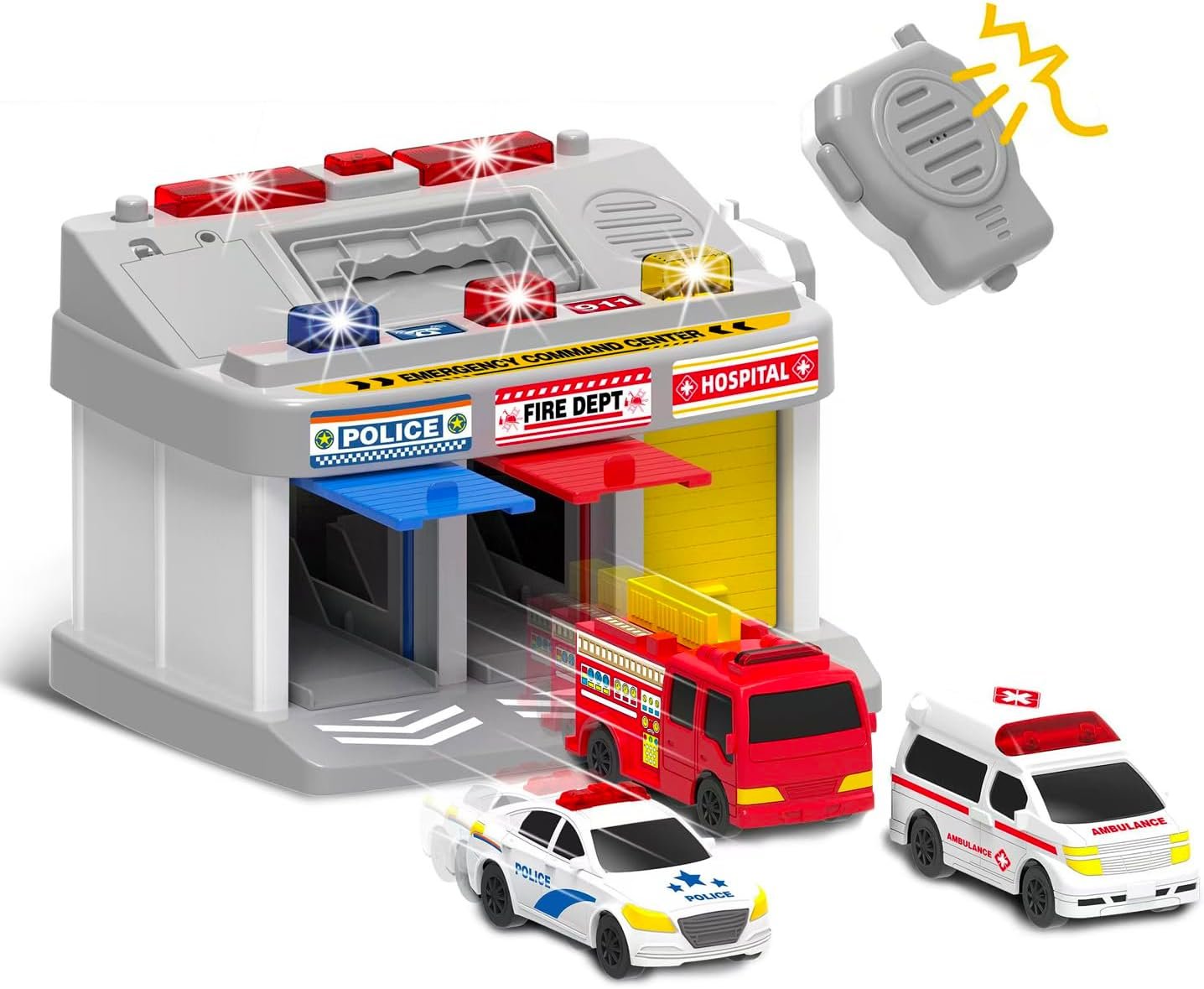 REALISTIC RESCUE STATION PLAYSET : Garage toy set comes with 3-Bay Parking garage for the included 3 Toy Rescue Vehicles: 1 x Fire Truck, 1 x Ambulance, 1 x Police Car. Just posh the blue button and ready to go. They also feature alarm sound and flashing light. The siren sounded,protect the city.