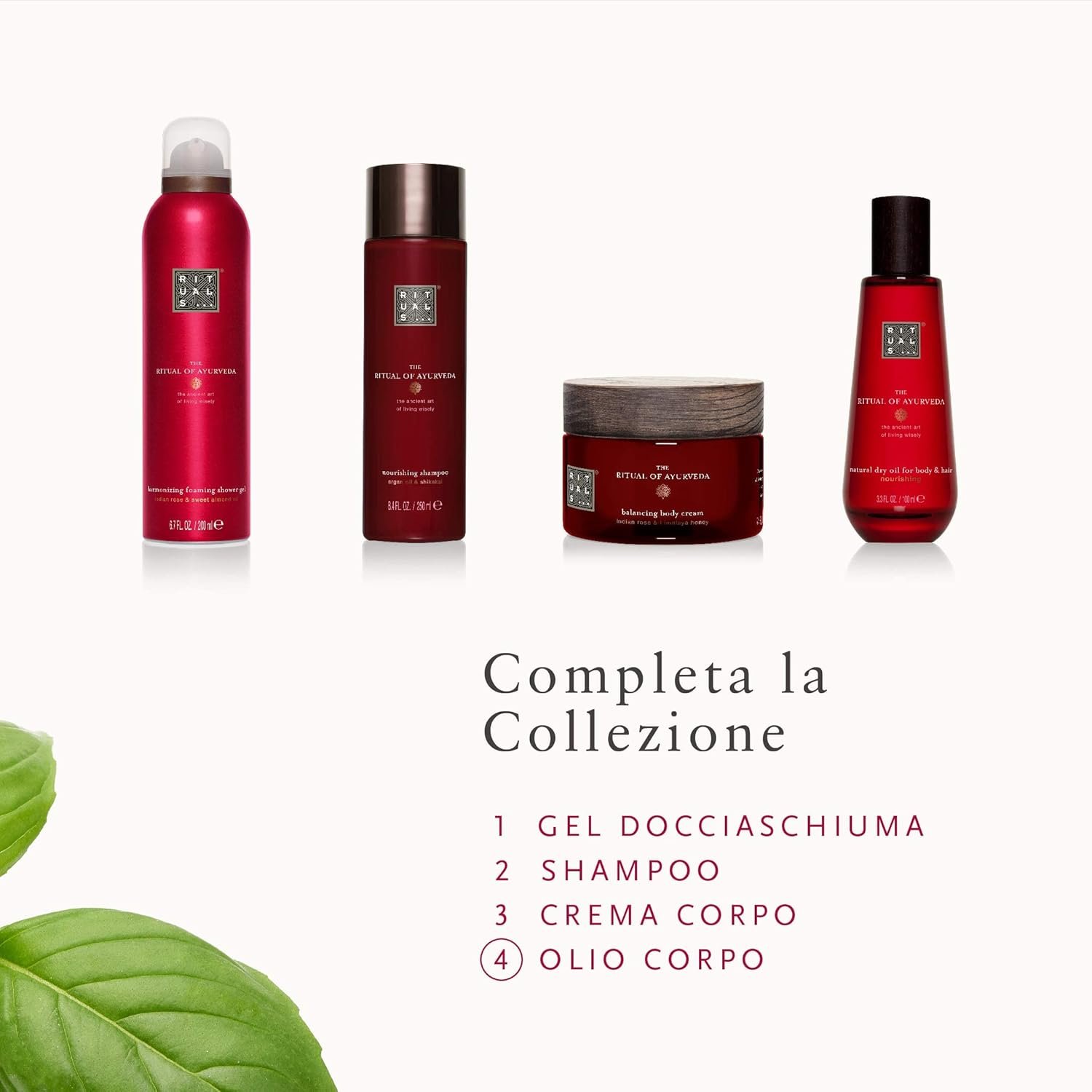 Rebalancing Body Oil: Discover the magical world of abhyanga (self-massage) thanks to this dry oil. Enriched with nourishing herbs & specially designed to balance the Vata dosha, this dry oil nourishes the skin according to Ayurvedic tradition. Rebalancing Body Scub: This purifying scrub leaves an intensely soothing thin layer of oil on your skin. Enriched with the delightful aroma of Indian rose and the soothing effects of sweet almond oil. Rebalancing Foaming Shower Gel: Create a balance between mind, body, and soul with this foaming shower gel from The Ritual of Ayurveda. It leaves your skin feeling silky soft and nourished. Rebalancing Body Cream: Harmonize body, mind, and soul with this luxurious body cream from The Ritual of Ayurveda. Featuring the delicately sweet aroma of Indian rose and the soothing effects of Himalaya honey.