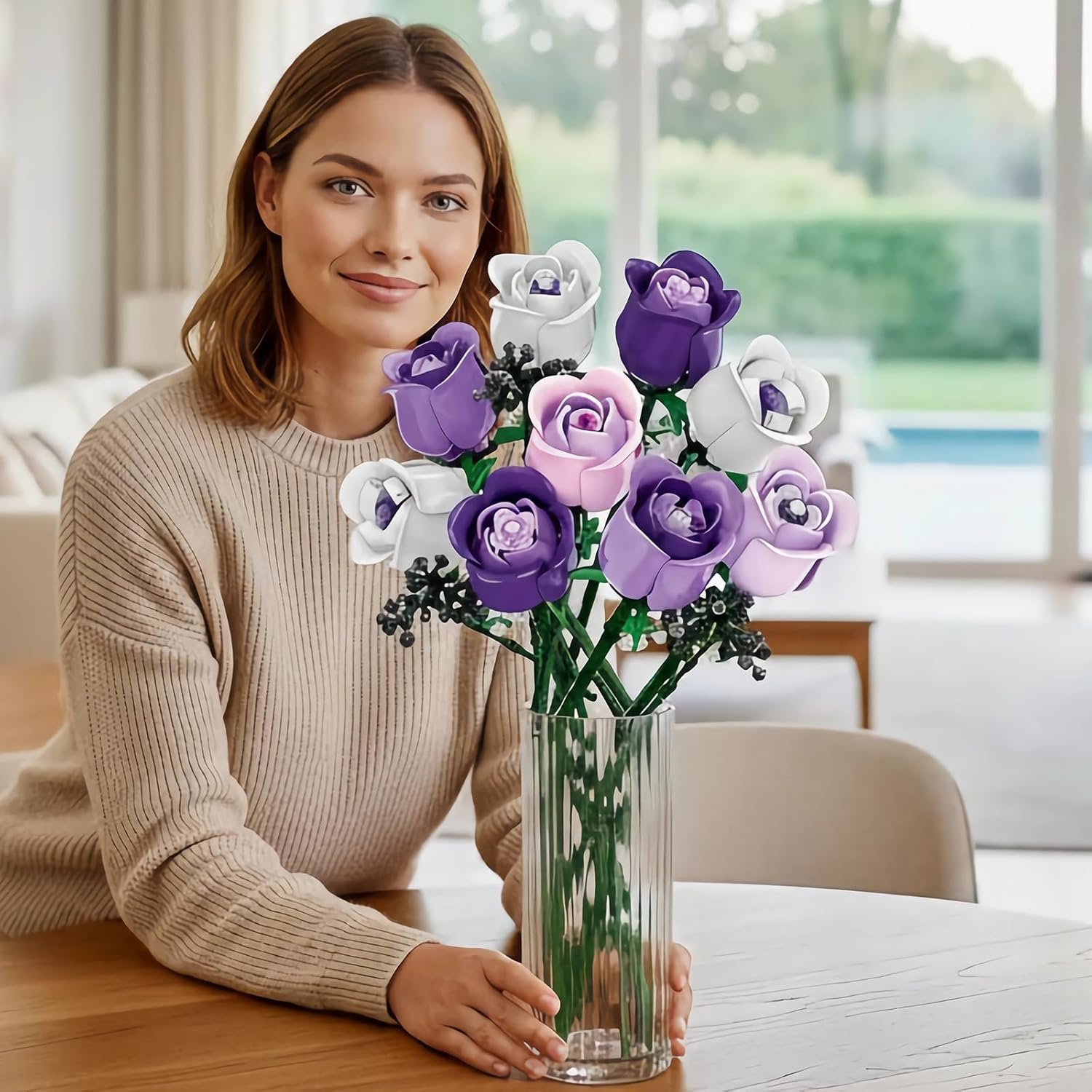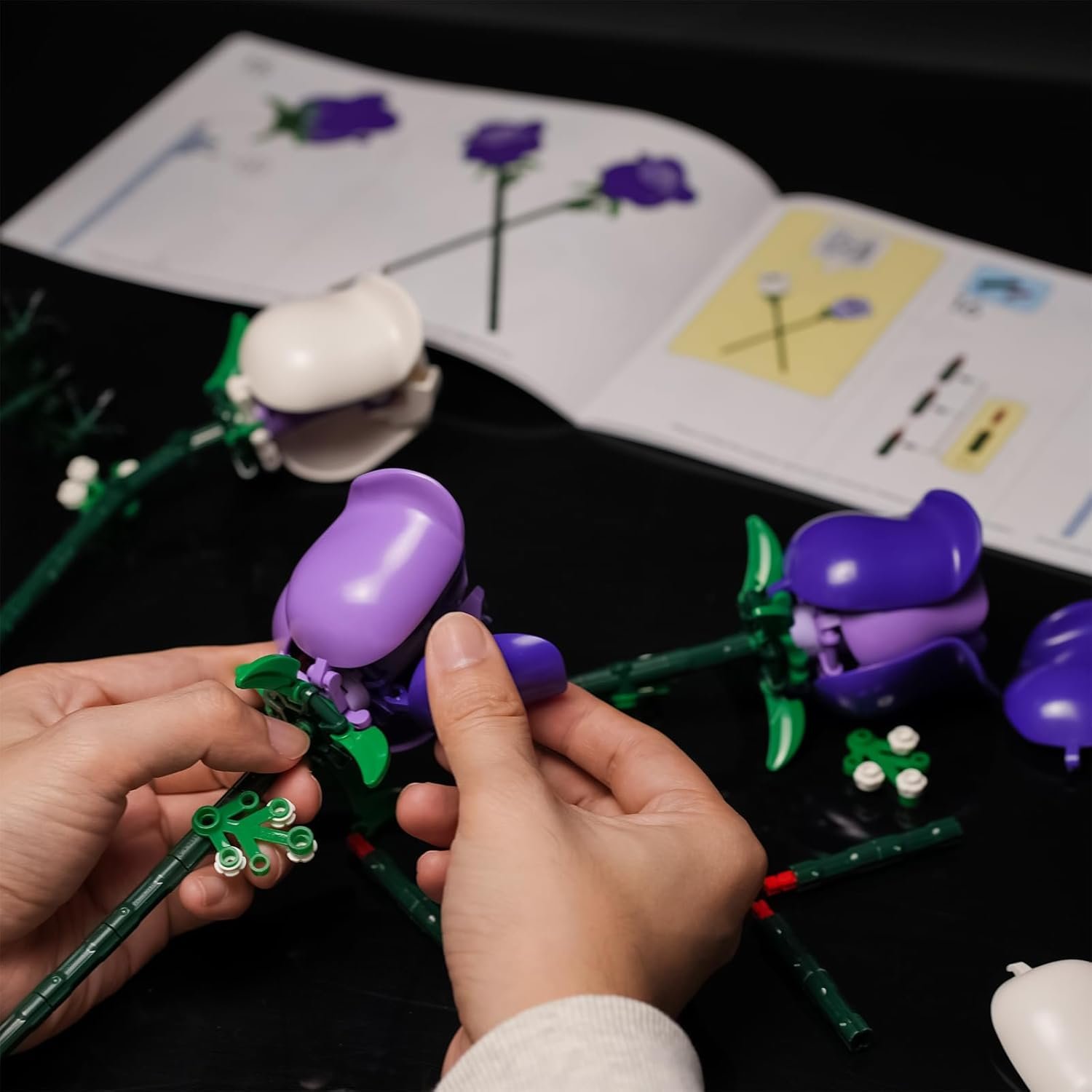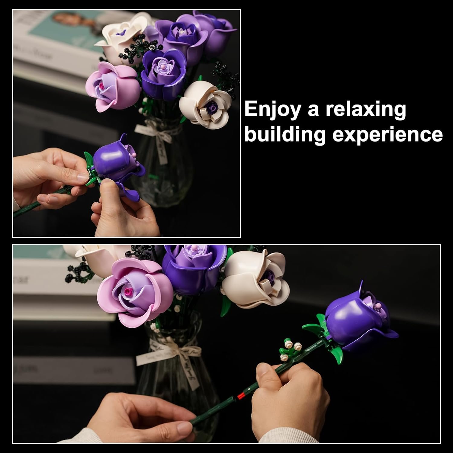 Easy to assemble: This flowers bouquet building kit included 9 pink roses,3 baby’s breath with buildable stems.A easy reading manual and a giftable box
