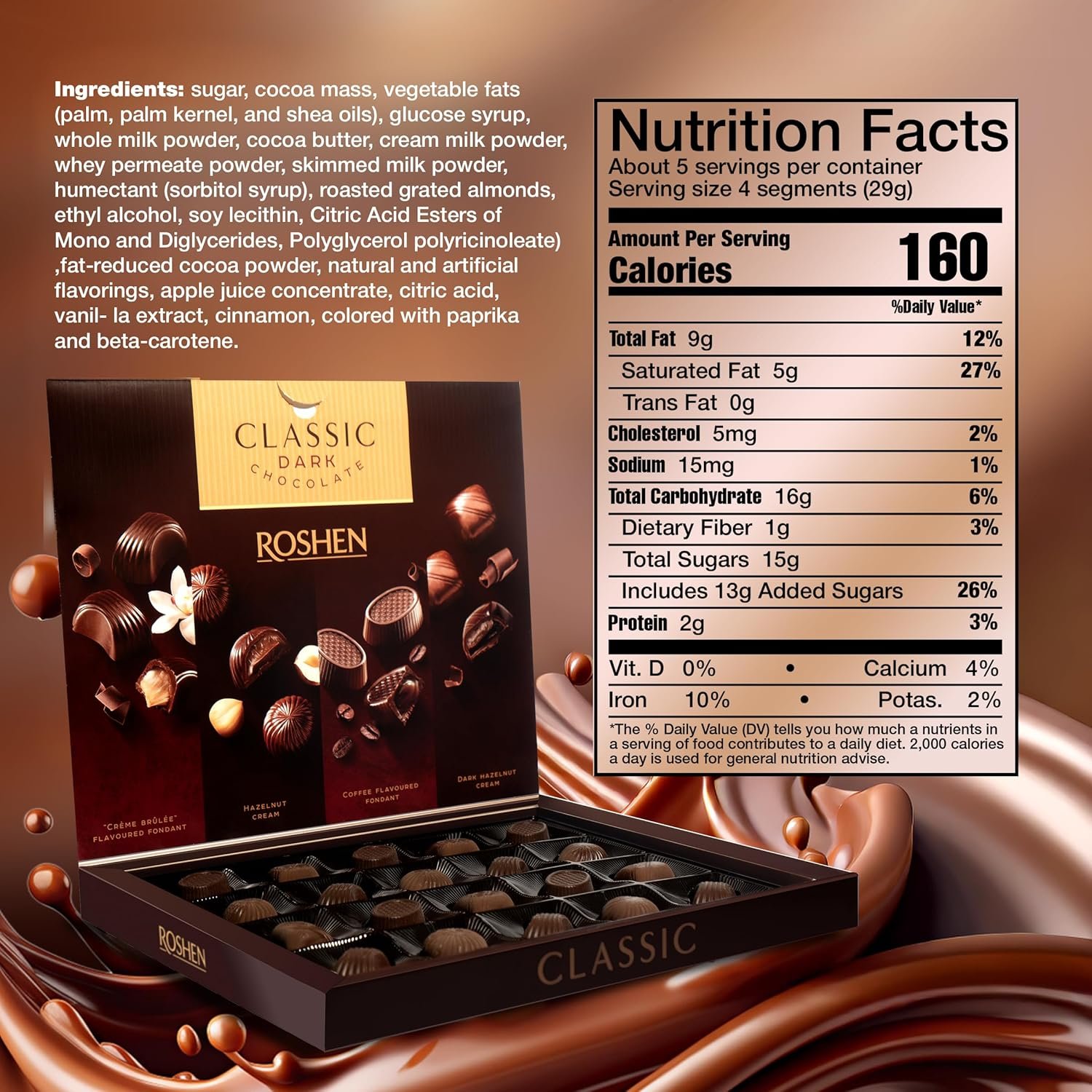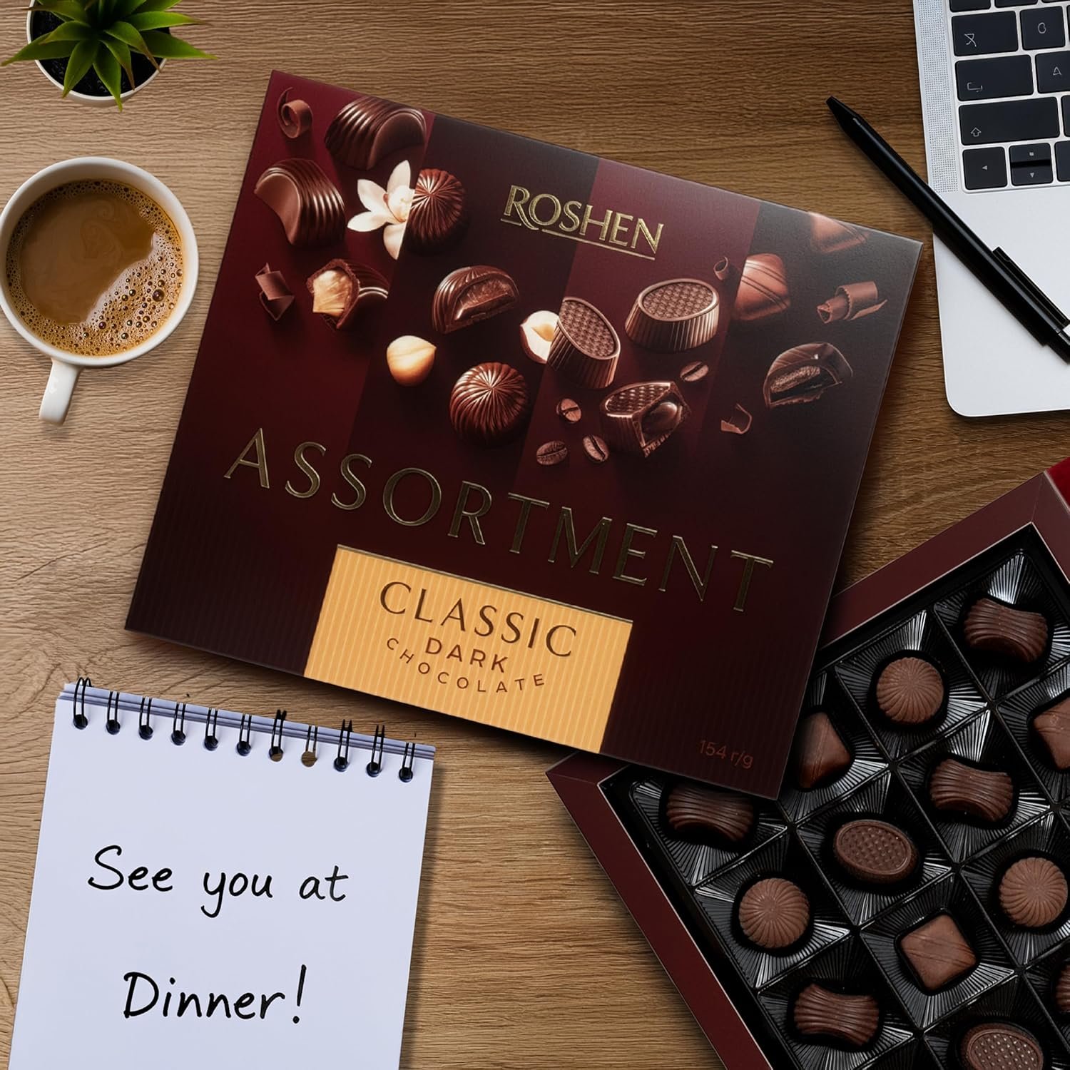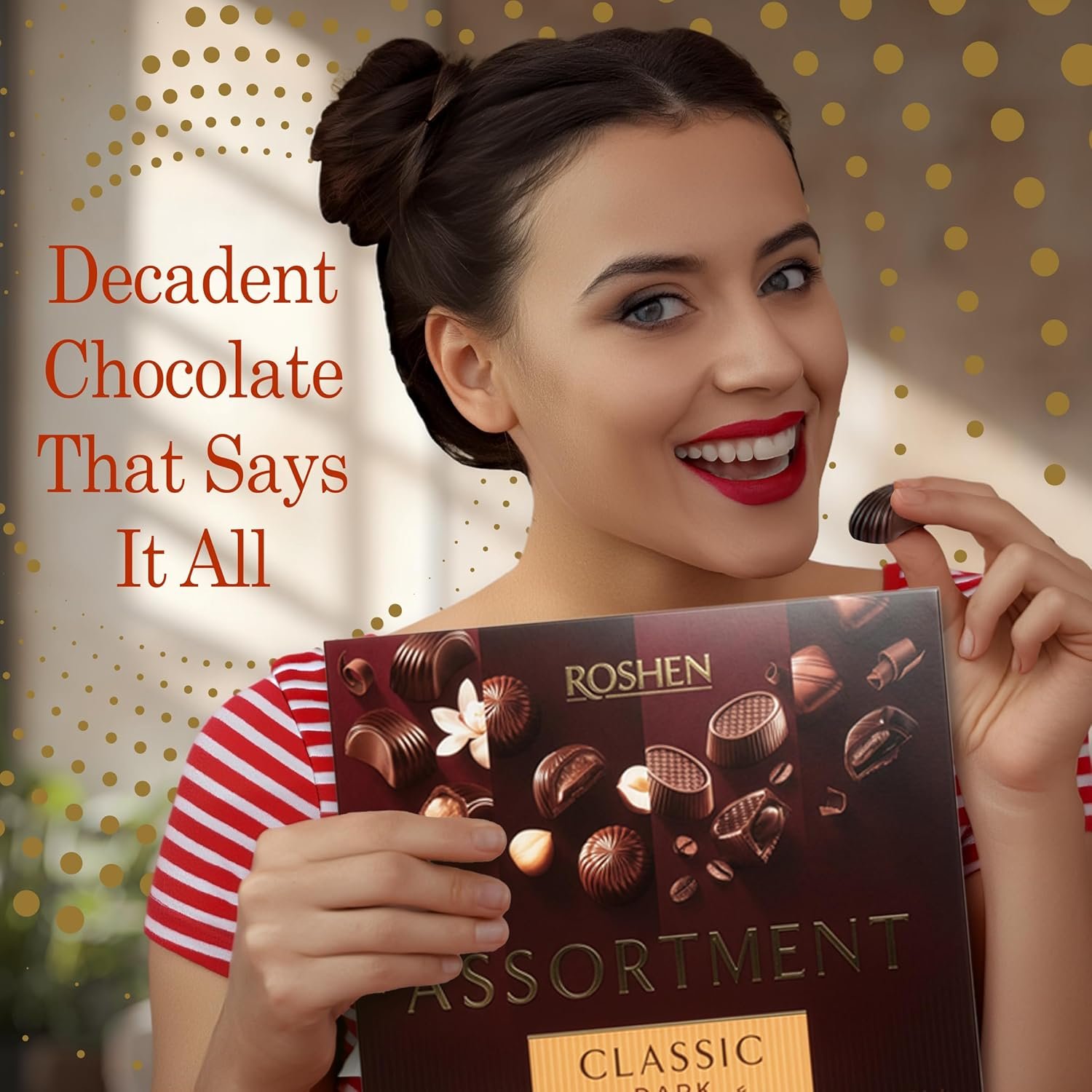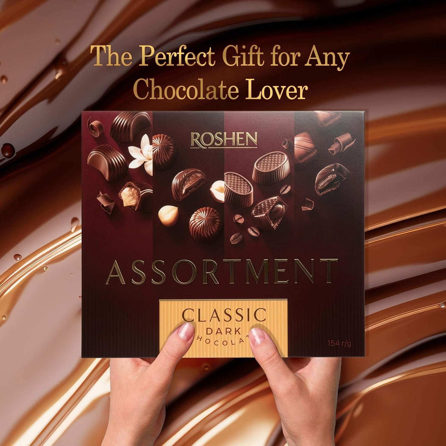 Sophisticated European Chocolate Collection: Indulge in a premium assortment of dark chocolate pralines crafted by Roshen, featuring rich, smooth fillings inspired by classic European confectionery traditions.