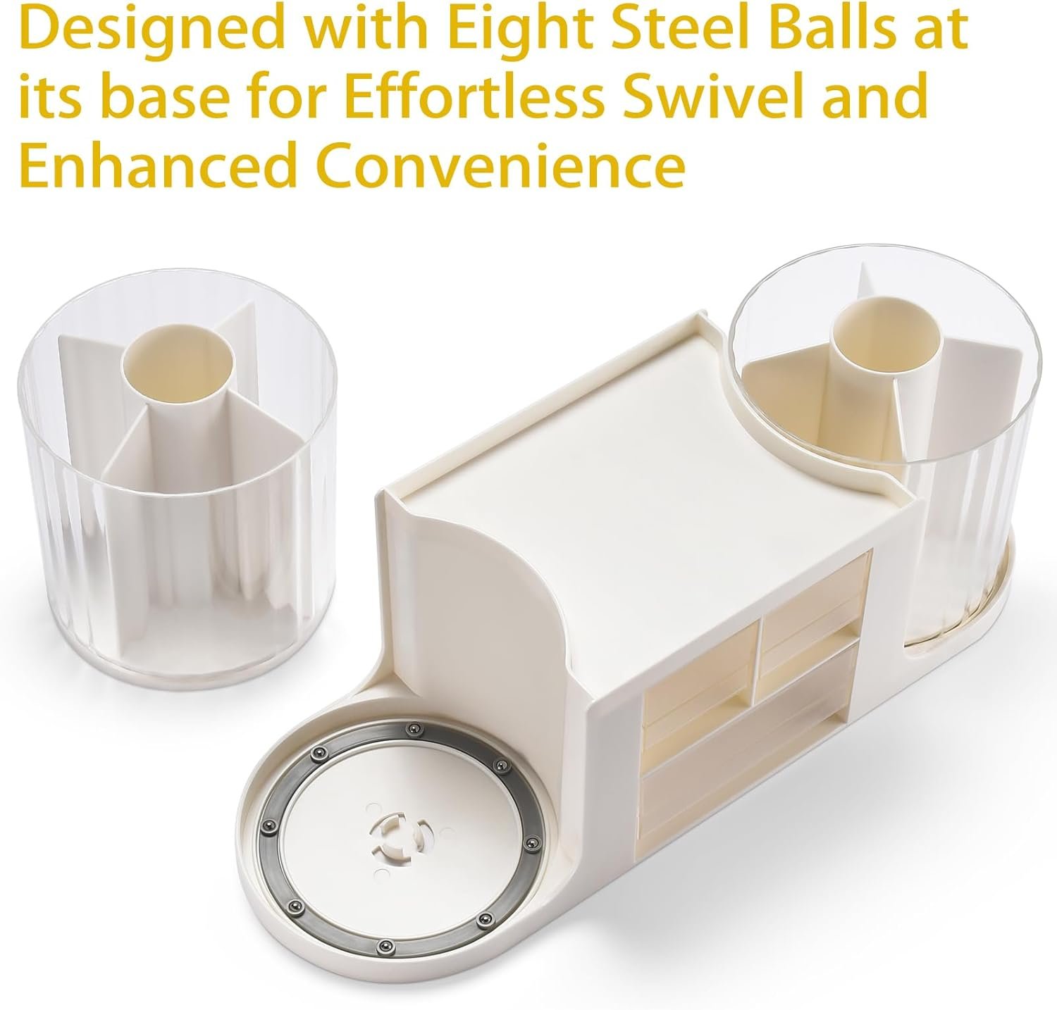 【Multi-purpose Rotating Desk Organizer】Ideal desk storage for desk accessories. Good desk organizer with drawers for small desktop stationery supplies, sticky notepads. Great for scissors, tape, stapler, flash drives, erasers, rubber bands, white-out, rulers, pens, pencils, paper clips, thumbtacks, highlighters, markers, glue. Holds arts and craft supplies, paintbrushes, household tools. Storage for reading glasses, cosmetics, makeup, jewelry, lipstick, cell phone, keys, business card.