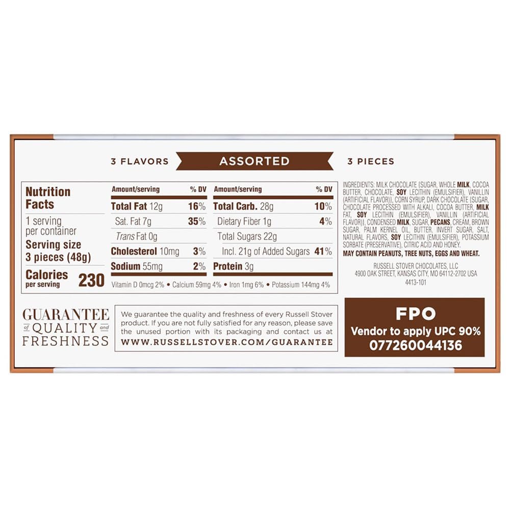 1 milk chocolate truffle; 1 milk chocolate pecan delight; 1 dark chocolate caramel.aramel. Made using the finest ingredients. 3 flavors assorted 3 pieces. An American classic. Guarantee of Quality & Freshness: We guarantee the quality and freshness of every Russell Stover product. If you are not fully satisfied for any reason, please save the unused portion with its packaging and contact us at www.russelstover.com/guarantee. www.russellstover.com/guarantee.