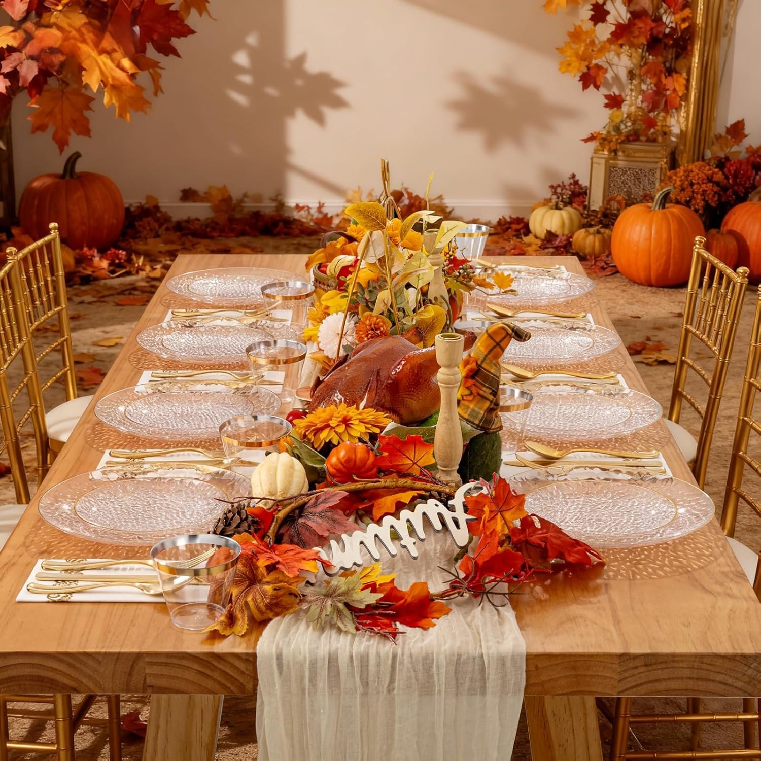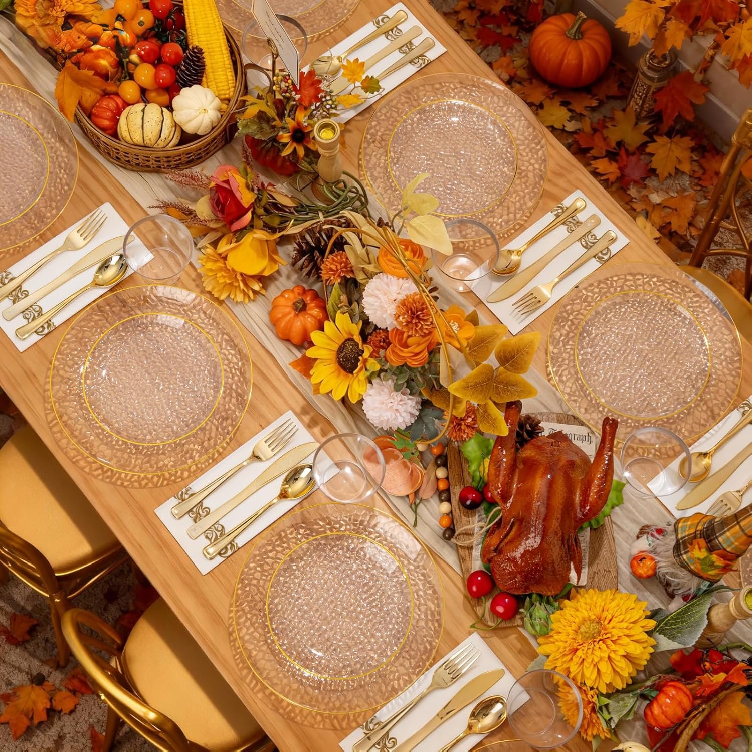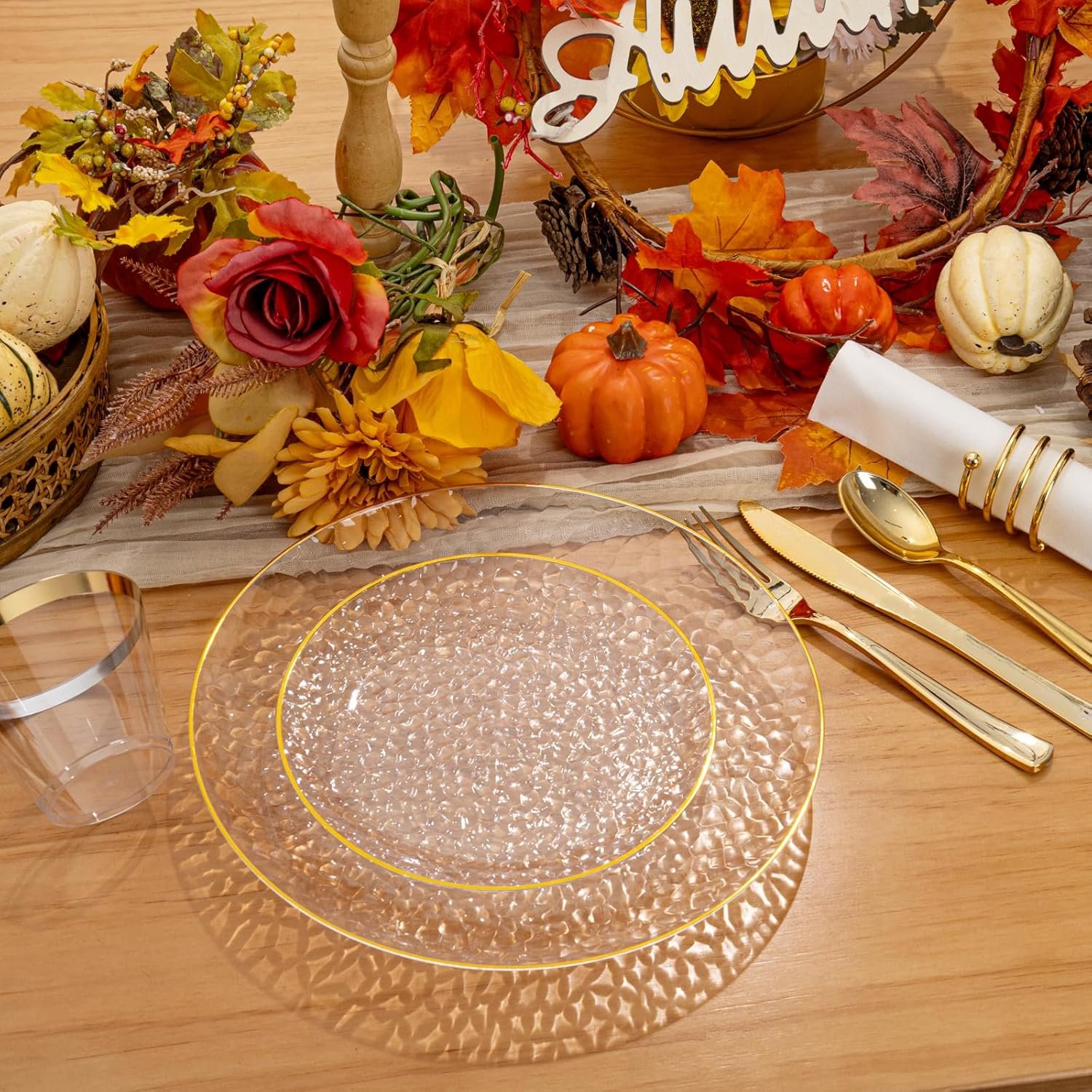 Elegant Design: Our clear plastic plates with gold trim feature a stylish hammered pattern, adding a touch of sophistication to any event. Perfect for parties, weddings, banquets,thanksgiving parties ,and Christmas.
