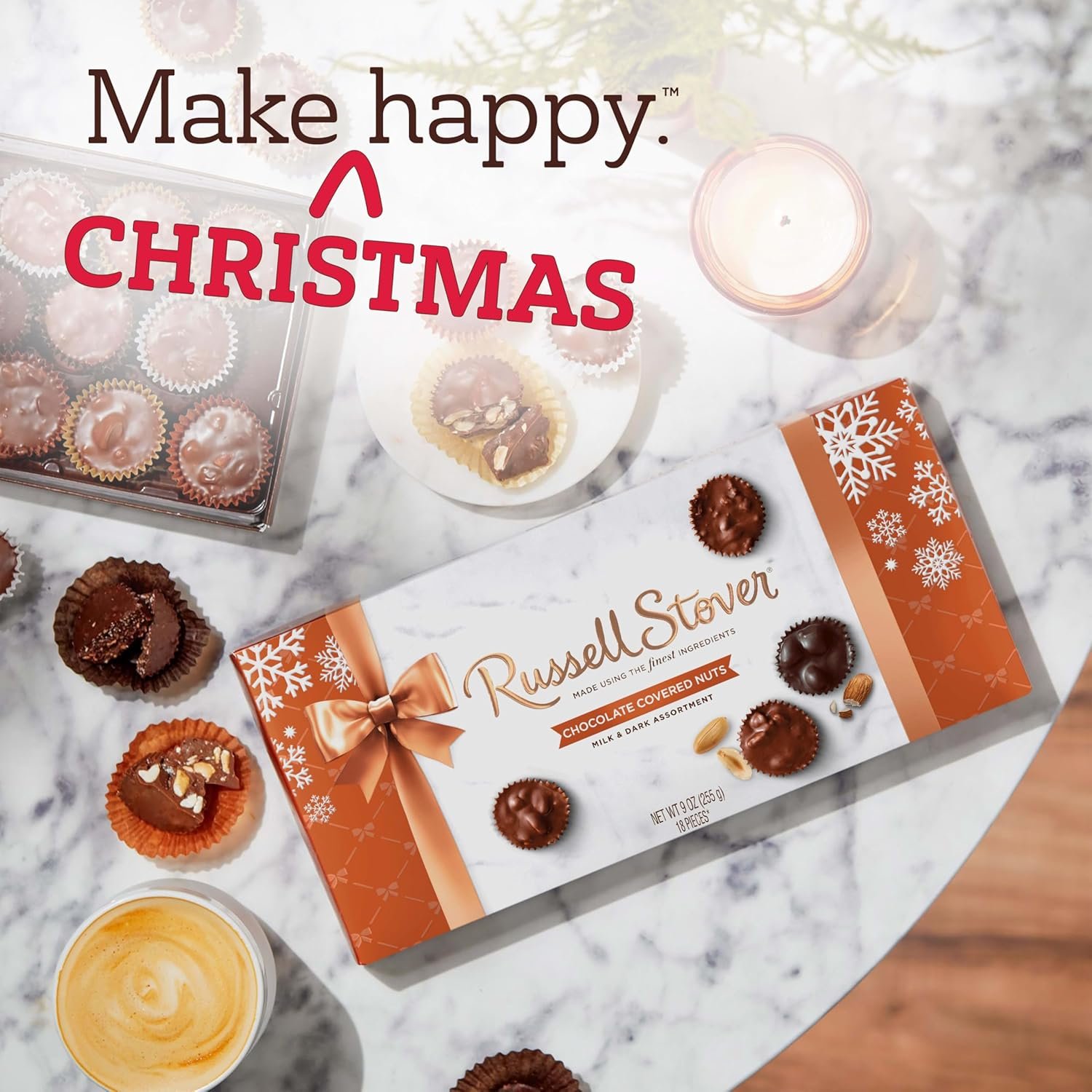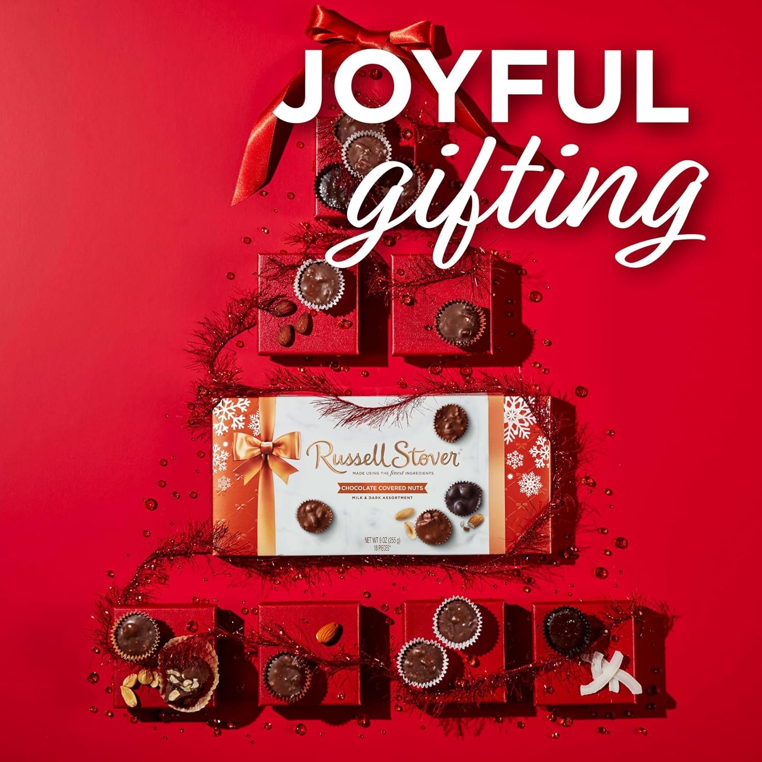 Share the joy of the season with RUSSELL STOVER Christmas Chocolate Covered Nuts Assortment in Milk Chocolate & Dark Chocolate Gift Box, 9 oz., a festive holiday gift for friends and family!