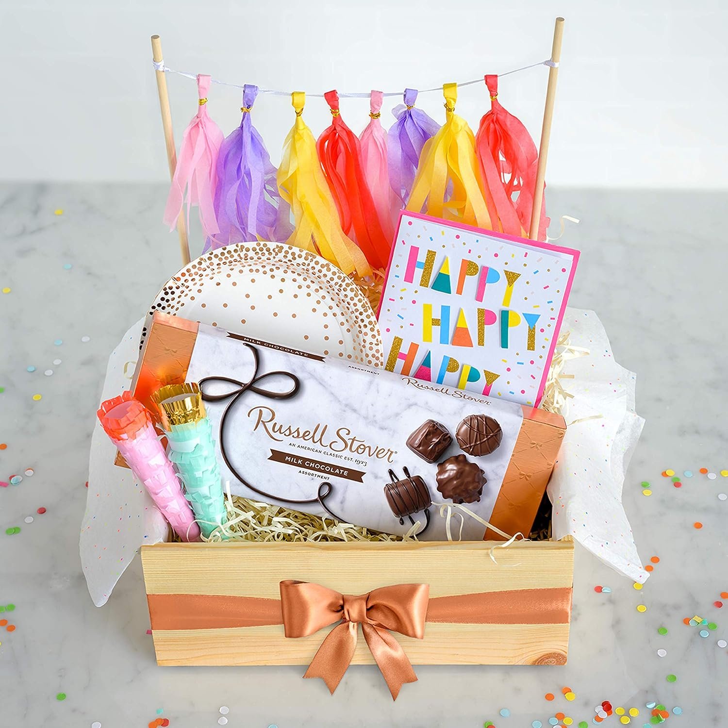Milk Chocolates: The Russell Stover Milk Chocolate Assortment Gift Box includes milk chocolate caramels, milk chocolate truffles, milk chocolate pecan delights, milk chocolate toffees, milk chocolate nut caramels, and milk chocolate peanuts