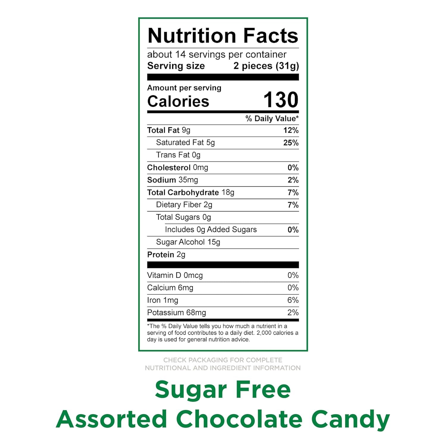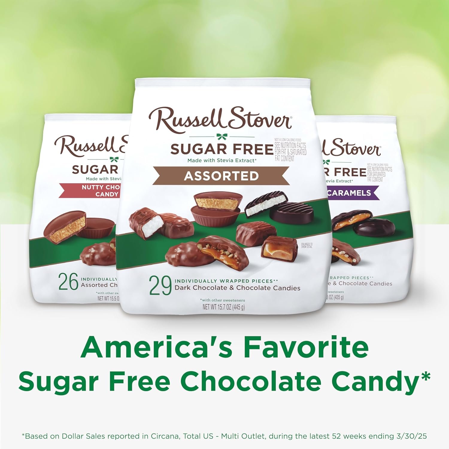 Indulge in the irresistible taste of RUSSELL STOVER Sugar Free Assorted Chocolate Candy. Each 15.7 oz. bag contains about 29 individually wrapped pieces of five assorted sugar free candy favorites: Caramel (chewy caramel covered in chocolate candy), Peanut Butter Cup (creamy peanut butter covered in chocolate candy), Pecan Delight (crunchy pecans & chewy caramel covered in chocolate candy), Coconut (rich and delicious coconut covered in chocolate candy) and Mint Patty (light airy mint covered in decadent dark chocolate). Crafted with Stevia extract, a plant-based sweetener, our sugar free pecan delights offer the perfect balance of sweetness without compromising on flavor. Each piece is individually wrapped for an on-the-go treat, filling up the candy bowl or thoughtful sharing. An American classic since 1923, RUSSELL STOVER has been honoring the craft of chocolate-making using only the finest ingredients and we are proud to offer great tasting, sugar free alternatives to your favorites! Discover the Unbelievable Taste of RUSSELL STOVER Sugar Free Assorted Chocolate Candy today!