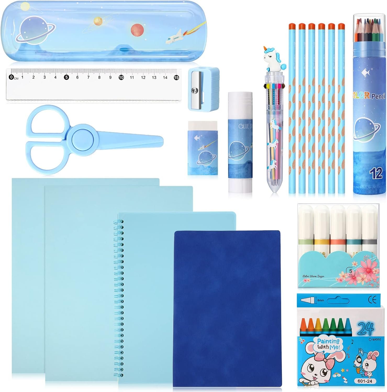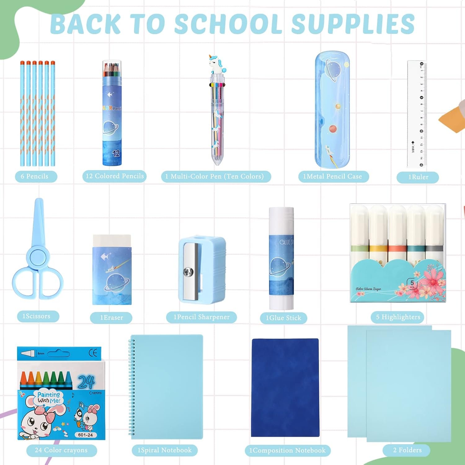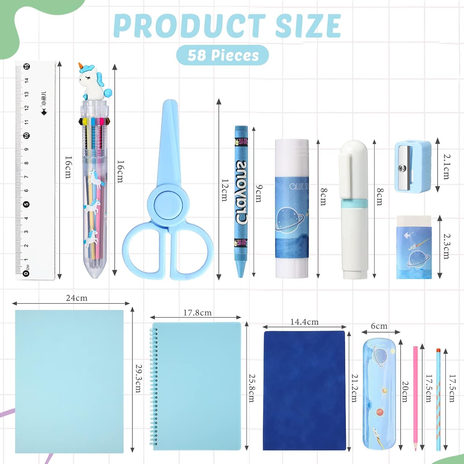 58 Pieces Back to School Supplies: there is 1 set of blue stationery set (including 6 pencils, 1 pencil sharpener, 1 metal pencil case, 12 colored pencils, 1 scissors, 1 eraser, 1 glue stick and 1 ruler), 1 multi color pen (10 color), 5 highlighters, 24 color crayons, 2 pocket folders, 1 notebooks, and 1 composition book, 58 pieces in total, enough for you to use when backing to school
