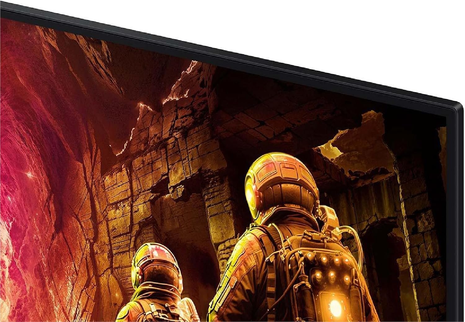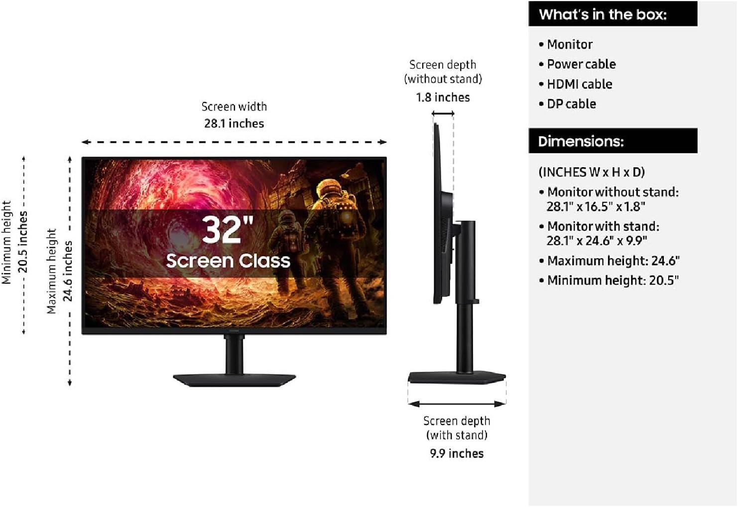Samsung’s 32″ Odyssey G5 QHD Gaming Monitor delivers brilliant visuals for exhilarating gameplay that’s more immersive than ever before. QHD resolution (2560 x 1440), with more than 1.7 times the pixel density of Full HD, boasts incredibly detailed, pin-sharp images. The fast IPS panel, with its 178° viewing angle, provides an engaging gaming experience by consistently delivering crisp, clear hues from various viewpoints. 180Hz Refresh Rate and 1ms response time (GtG) allow ultimate speed for ultra-smooth gaming precision, while G-Sync compatibility syncs the GPU and panel to reduce choppiness, screen lag, and image tearing. Scenes feel more realistic with HDR10, which provides brighter highlights and nuanced shadows for added depth. Black Equalizer improves visibility in the deepest shadows, while Virtual Aim Point increases the accuracy of the player’s aim when the action peaks. Auto Source Switch+ allows instantaneous switching between connected devices without having to flip through multiple inputs. Maintain winning streaks in total comfort with the height-adjustable Ergonomic Stand that easily pivots, tilts, and swivels for the perfect view.