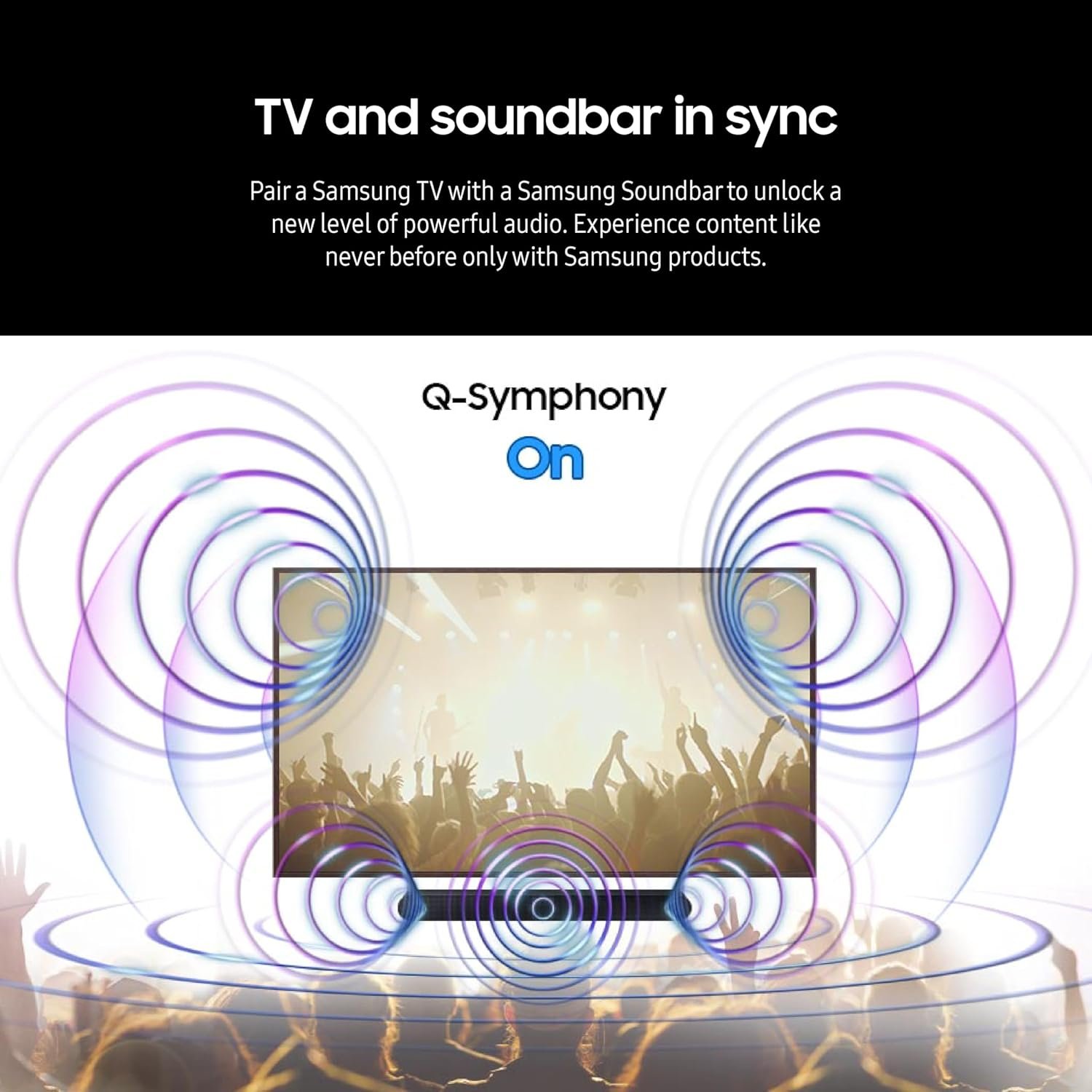 Q-SYMPHONY: Pair a Samsung TV with a Samsung Soundbar for a new level of powerful audio; Experience content like never before only with Samsung products; With Q-Symphony, your speakers work together to optimize all audio channels to operate as one¹