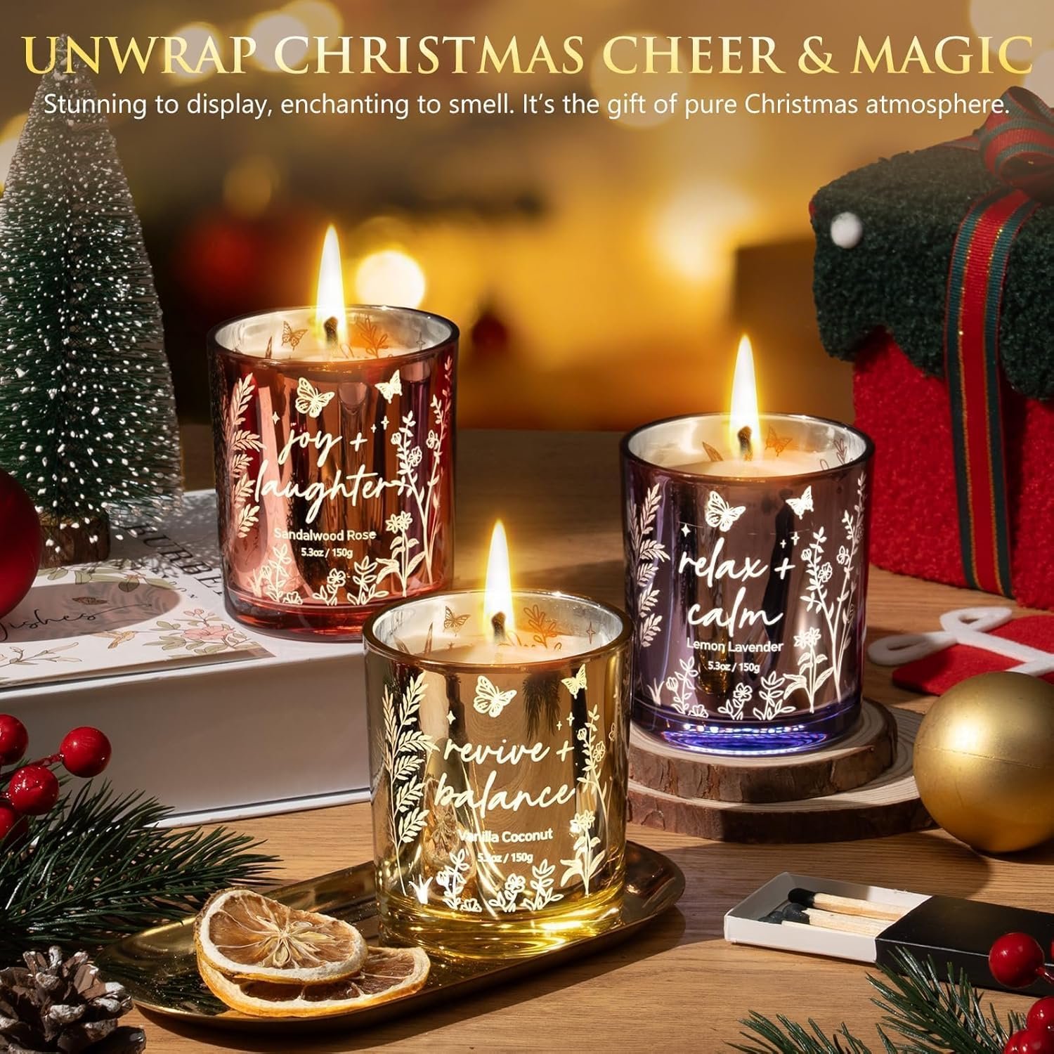 SPECIALLY DESIGNED CANDLES: Measuring 0.75”L x 0.75”X 3.19”H, this petite scented candle with unique laser-etched hollow-out design, allow the light flowing through the patterns like gold and create a magical warm glow. Small enough to tucked it into Christmas stocking as a christams gifts, so you can share single or the whole presented in our charming book-inspired flip-top box. Surely a unique birthday gifts thanksgiving gifts, christmas candle gift set for wome friends mom sister grandma