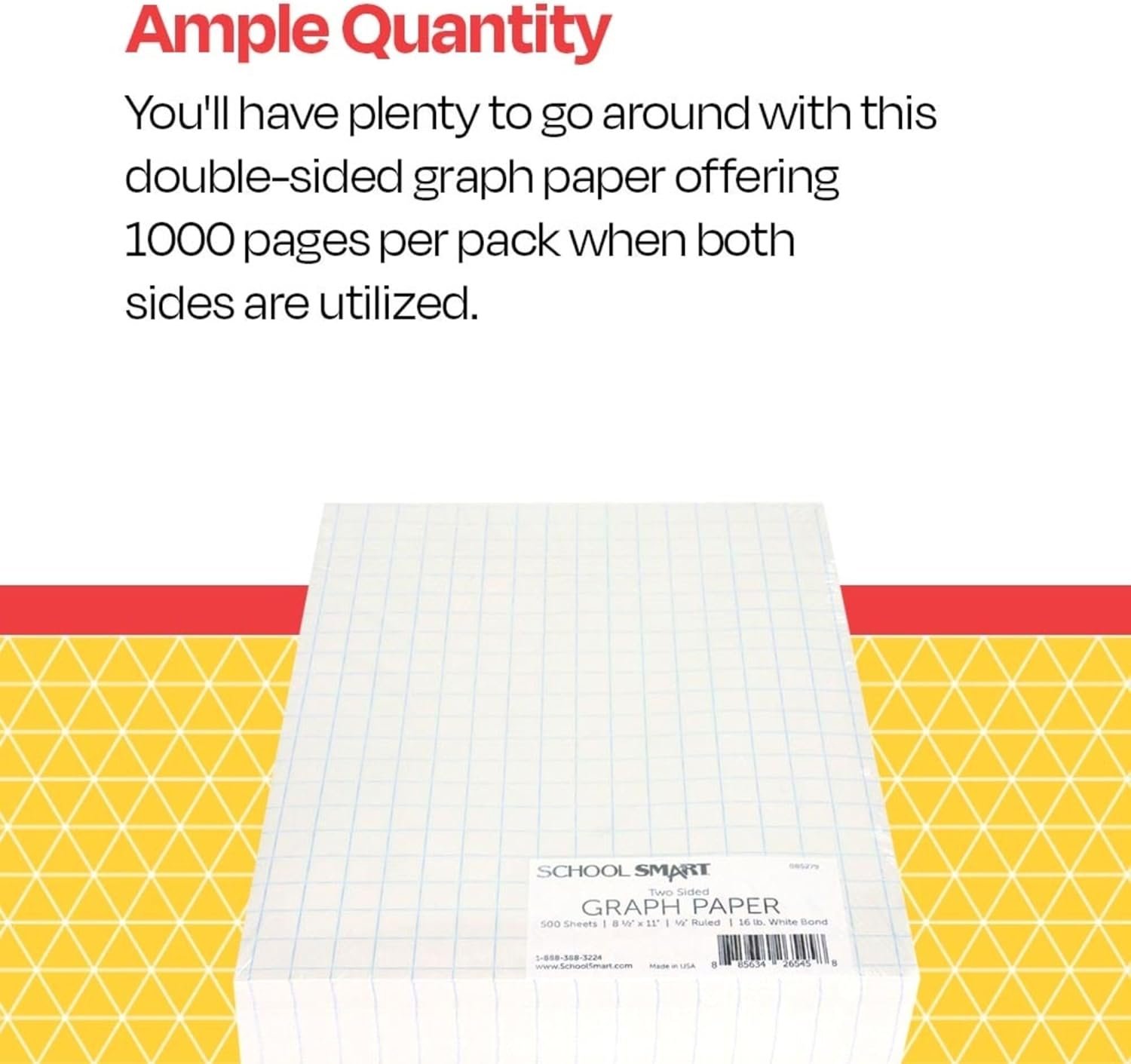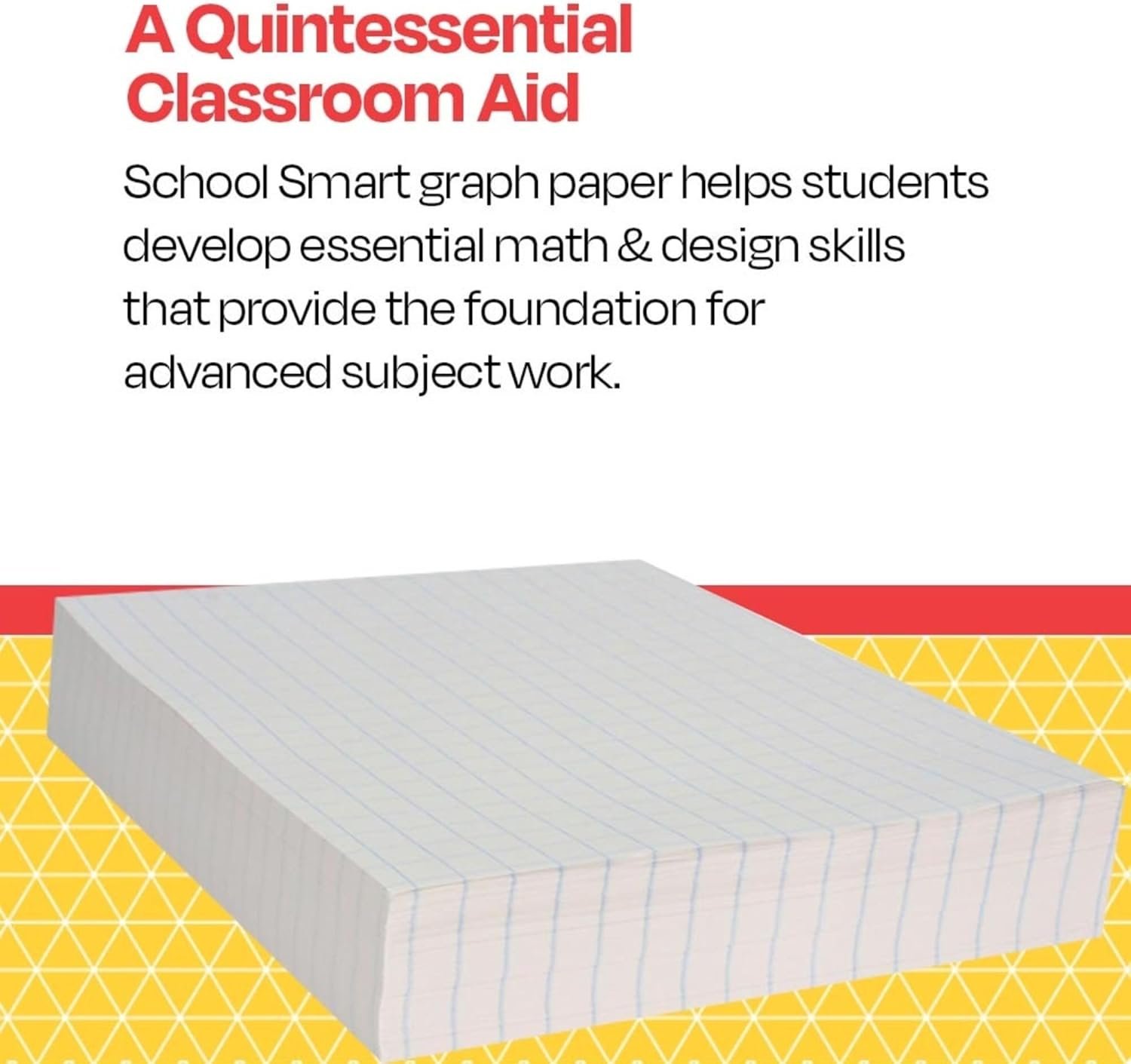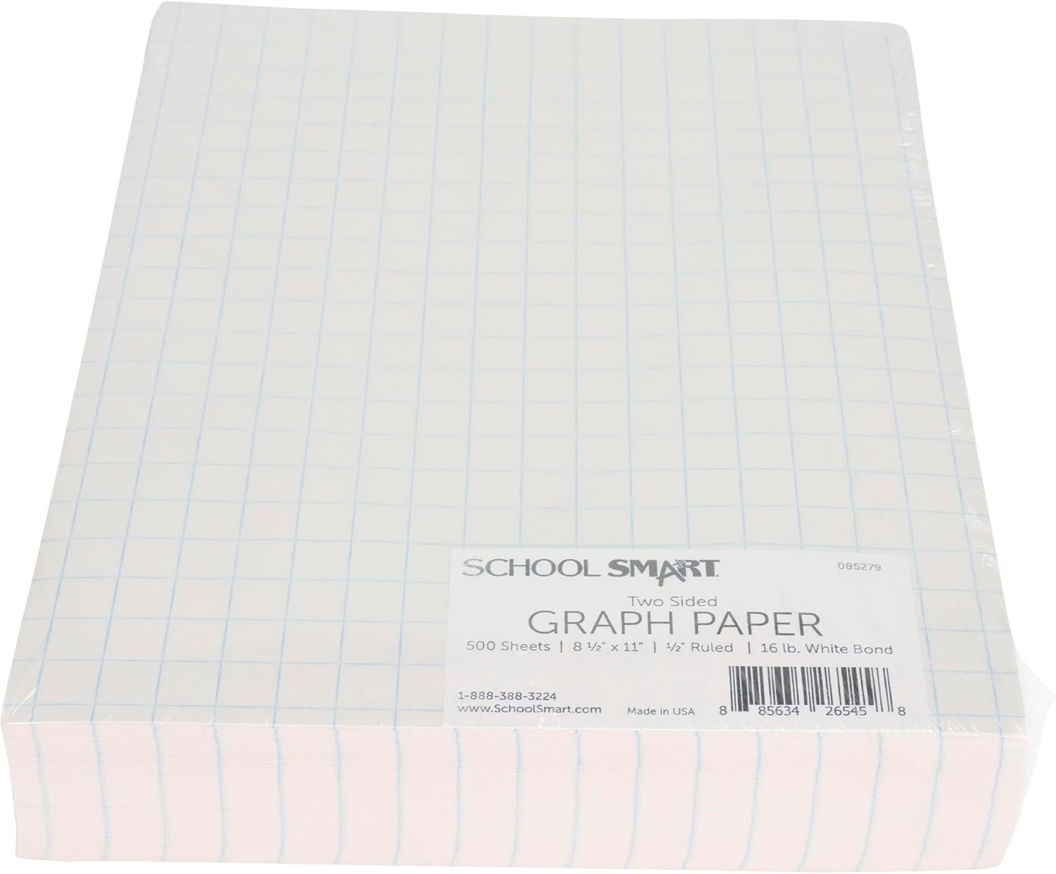 School Smart Graph Paper features white bond paper ruled into small squares of equal size, making drawing precise charts, graphics, or diagrams quick and easy. Double-sided graph paper ensures ample room for practicing equations or shapes for geometry, and algebra with a 1/2 inch ruling on both sides. Accepts pen and ink media well with little to no bleed-through, and provides clean erasure for pencil marks. Each sheet has a 15 lb basis weight and measures 8-1/2 x 11 inches. Sold as 500 sheets. Download School Smart Ruled Paper Guide