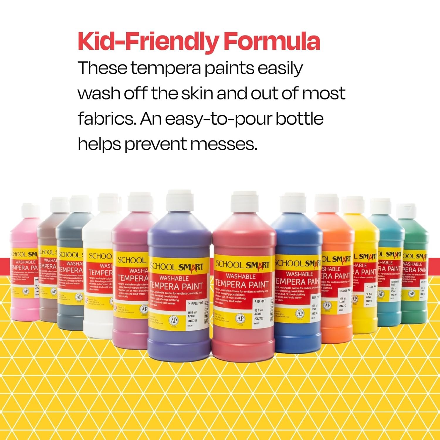 Nothing is as rewarding for kids as seeing what their imagination lets them create. Our Washable Tempera Paints are the perfect resource to let kids have unlimited fun while helping them learn and grow. They are also great for older students because the smooth-flowing formula offers endless color-blending possibilities. They’re perfect for art classes, school projects, or to keep around the house to use on a rainy day. The washable design means less of a headache for teachers, educators, and parents and allows children to create artwork without having to stop and constantly clean up. Tempera paint is a favorite among young and old artists because it works on various surfaces, from paper, cardboard, poster board, glass, wood, and more. Because our paints are non-toxic*, kids of all ages can get in on the fun. The bulk-size bottles allow for endless creative possibilities, so the fun never ends. School Smart offers genuine, reliable, and smartly made products designed to give educators peace of mind without breaking the bank. We are focused on the everyday needs of classrooms, school offices, and beyond. From basic needs like paper, folders, and notebooks to more specific, curriculum-driven items like pocket charts and jump ropes for physical education classes, our products stand up to the rigors of your everyday learning. *AP Certification Placeholder