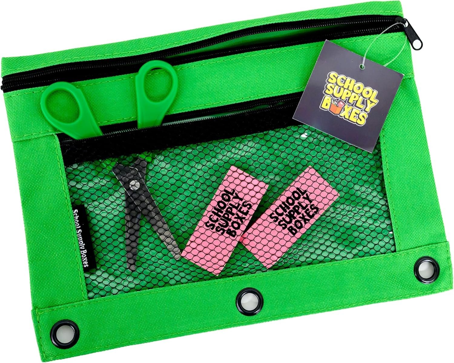 Comprehensive School Supply Set – Includes a 12-inch wooden ruler, 4 color-assorted folders, a 1” binder, 150 sheets of college-ruled filler paper, 3 college-ruled single-subject notebooks (assorted colors), a 24-count mechanical pencil box, a 3-pack of highlighters (blue, yellow, pink), a pencil bag, 5” blunt-tip scissors, and 2 pink erasers.