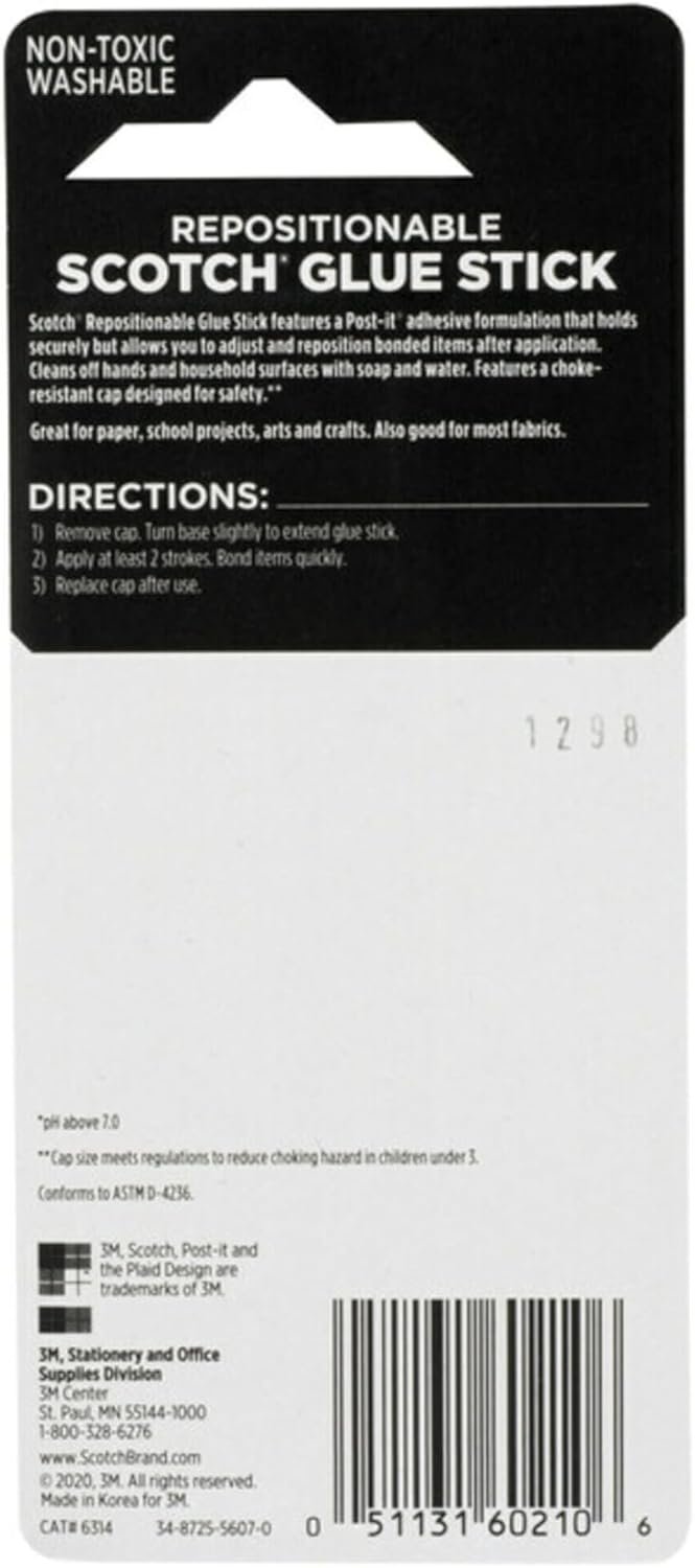 The Scotch Restickable Glue Stick is a versatile adhesive solution designed for a variety of applications, including school projects, scrapbooking, crafts, and layout work. Its repositionable nature allows you to adjust and move bonded items even after application, providing flexibility during the creative process. The glue is washable and non-toxic, making it safe for use by both children and adults. It cleans off hands and household surfaces easily with soap and water and can be washed out of clothes with soap and warm water. The adhesive dries clear, ensuring a neat and professional finish for all your projects. Each glue stick contains 0.49 oz of adhesive, offering ample supply for your crafting needs.