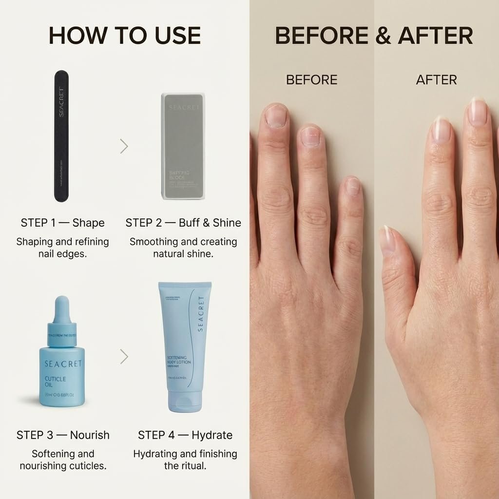 Complete Nail Care Kit: SEACRET Nail Care Collection includes a nail file, 3-way buffer, cuticle oil (1 oz), and body lotion (6.8 oz) enriched with Dead Sea minerals. Perfect for at-home manicures and pedicures.