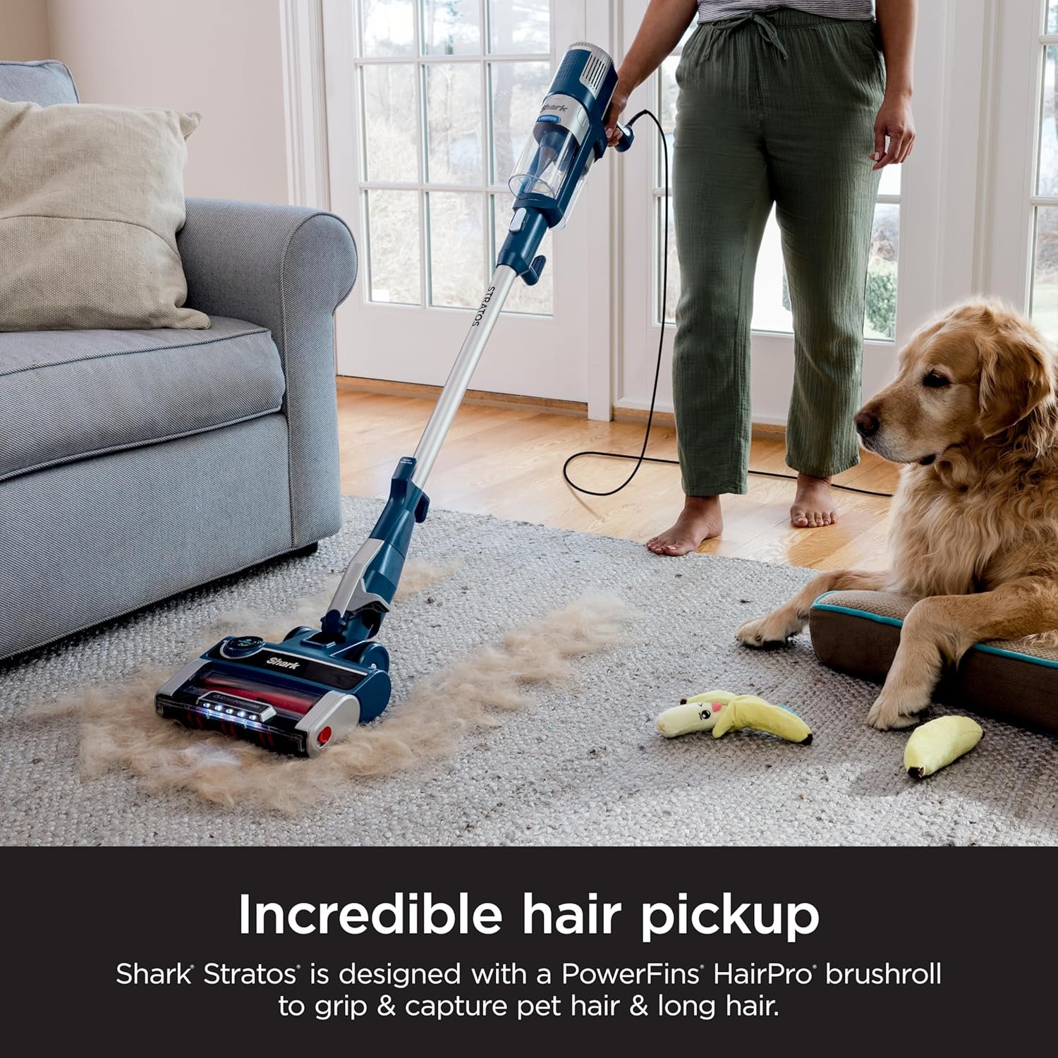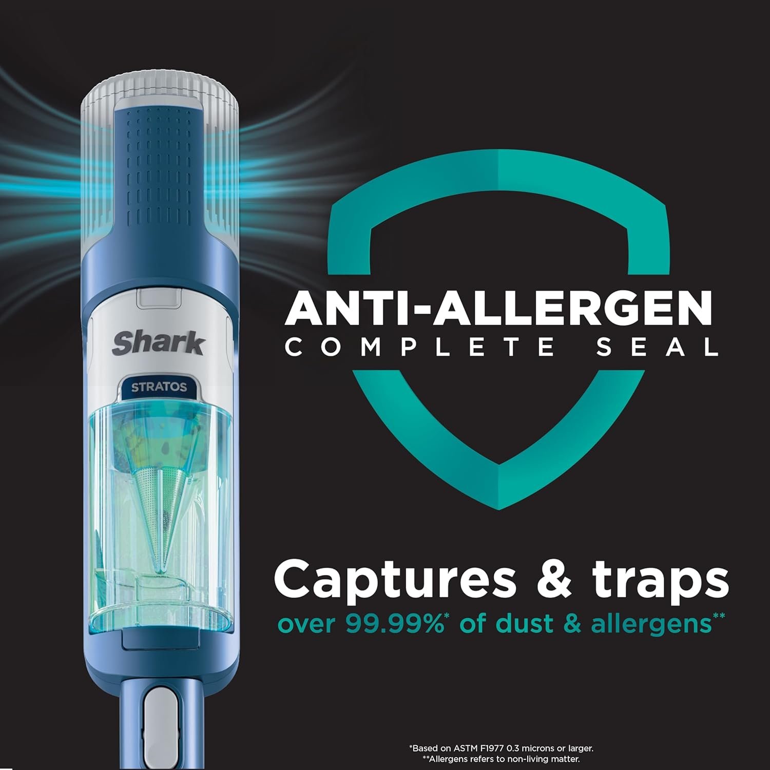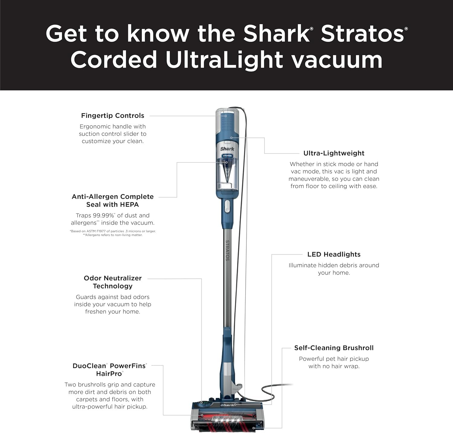 The Shark Stratos corded stick has ultra-powerful suction & hair pick up. It offers Shark’s advanced cleaning technology – a DuoClean PowerFins Hair Pro nozzle grips and captures more dirt, debris and hair, and Odor Neutralizer Technology guards against bad odors inside your vacuum. Plus, Anti-Allergen Complete Seal with HEPA filtration traps fine particles as you clean.