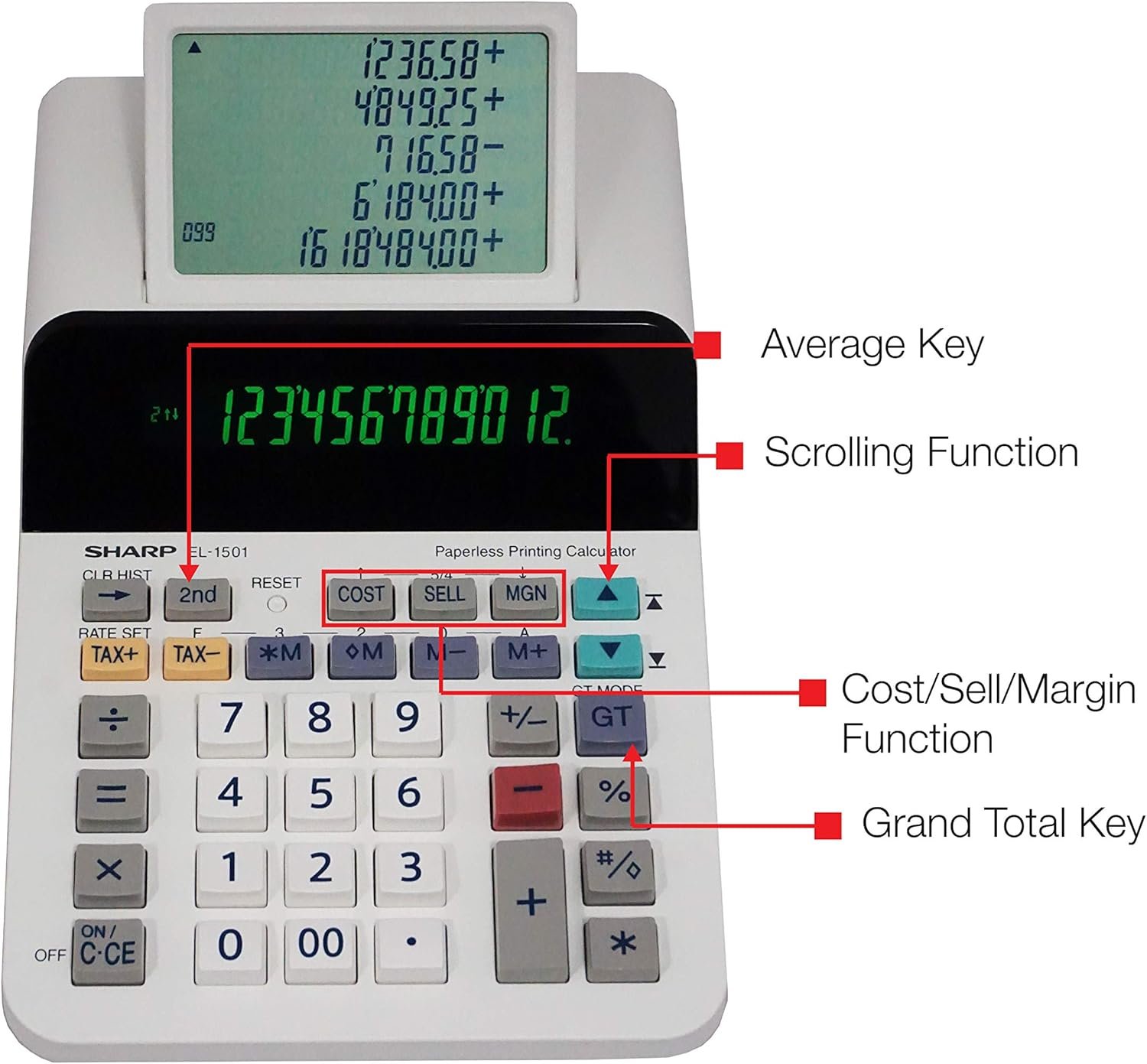 Paperless printing calculator with a 12-digit display features a unique, powerful design that combines the power of a printing calculator with the functionality of a desktop calculator. The large five-line, secondary LCD allows you to scroll back and forth up to 300 lines to refer back to your previous calculations. Cost/sell/margin keys simplify profit margin calculations by allowing you to simply enter two variables to automatically show the third variable. Battery-operated design with included batteries eliminates the need for an electric cord to use this calculator anywhere you need. Contoured keyboard helps you accurately input data for easy calculations. Calculator also includes four-key memory, tax keys, change sign key, backspace key, grand total with selector, rounding function and more.