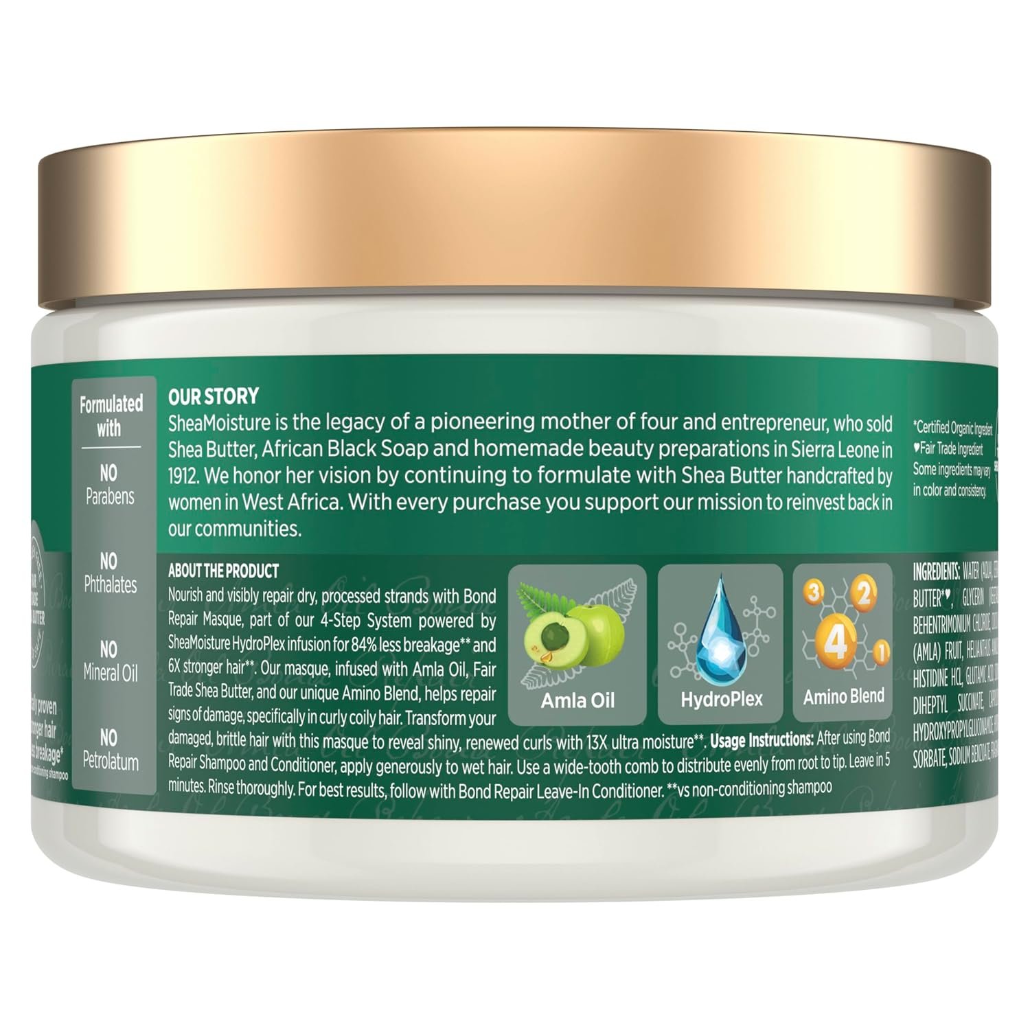 Tired of covering up signs of damage? Unmask your best hair yet with SheaMoisture Bond Repair Masque. It’s the type of deep hydration your hair has been craving. We put her through a lot – countless silk presses, protective styles and color treatments – so let the repair start now. No more breaking down over damaged hair. Our hair strengthening formula is infused with Hydroplex Technology, Amino Blend and Amla Oil to repair broken hair bonds from within and restore essential proteins to build up your hair’s strength and leave it healthy-looking, thriving and ready for the next style. One self-care mask treatment delivers much-needed moisture to each strand, coating it in luxurious hydration and visibly fixing every sign of styling damage. Your hair will go from damaged and broken to strong and healthy-looking with less breakage. Get ready to unmask stronger hair and put that damage behind you. It’s a weekly ritual you’ll feel good about making time for.