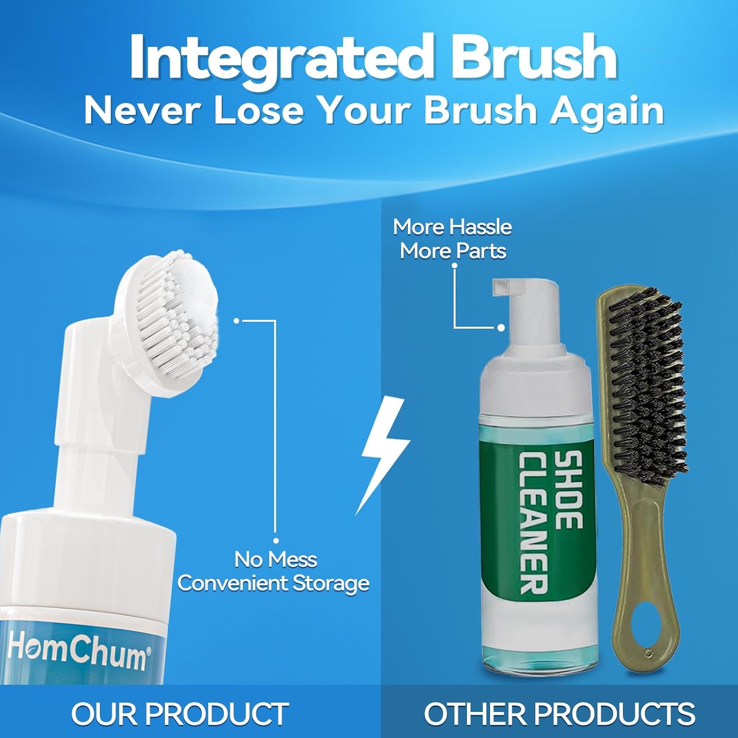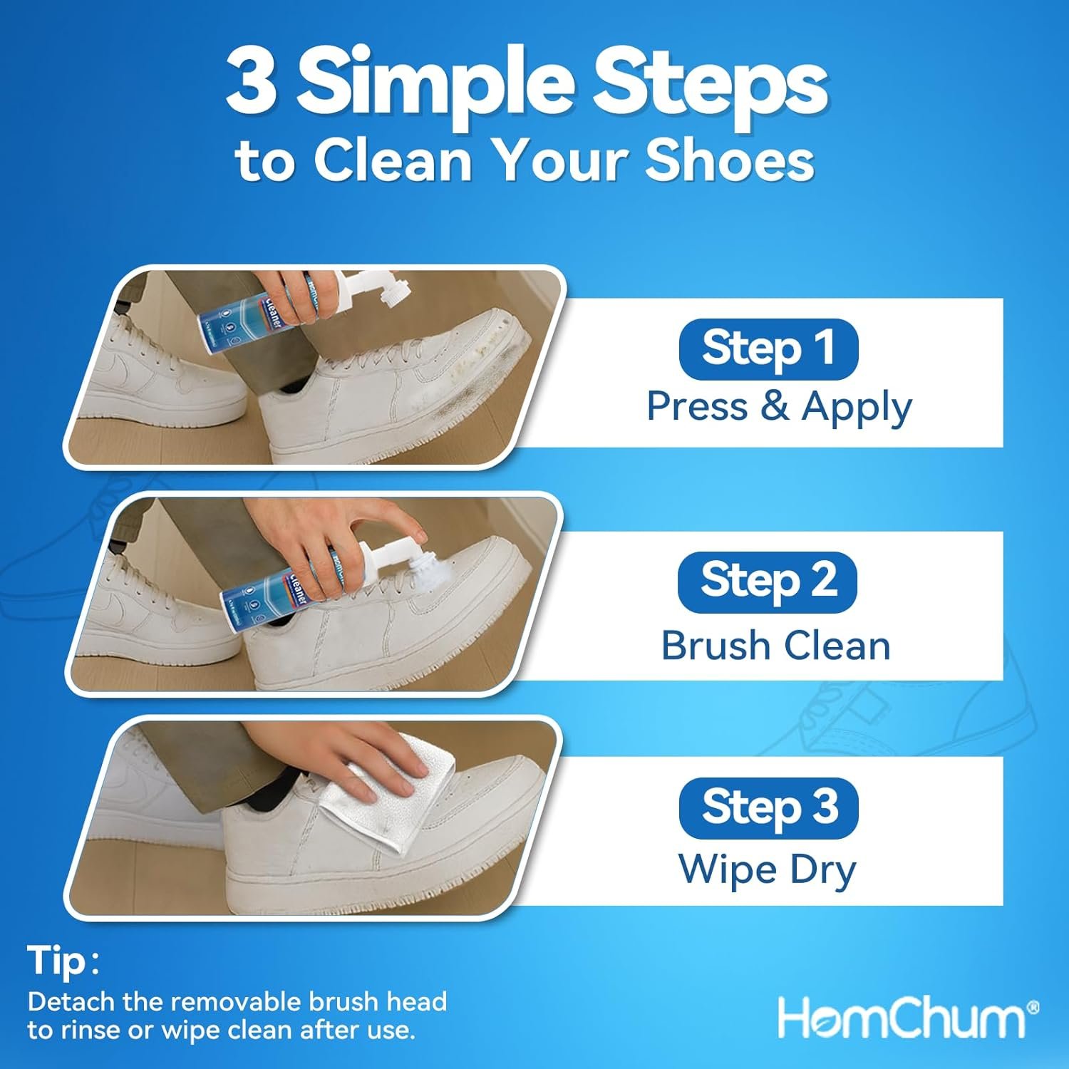 The all-in-one designed HomChum Shoe Cleaner is quick and easy to use with no need for water. Its gentle formula is bleach-free, and one bottle meets daily needs.