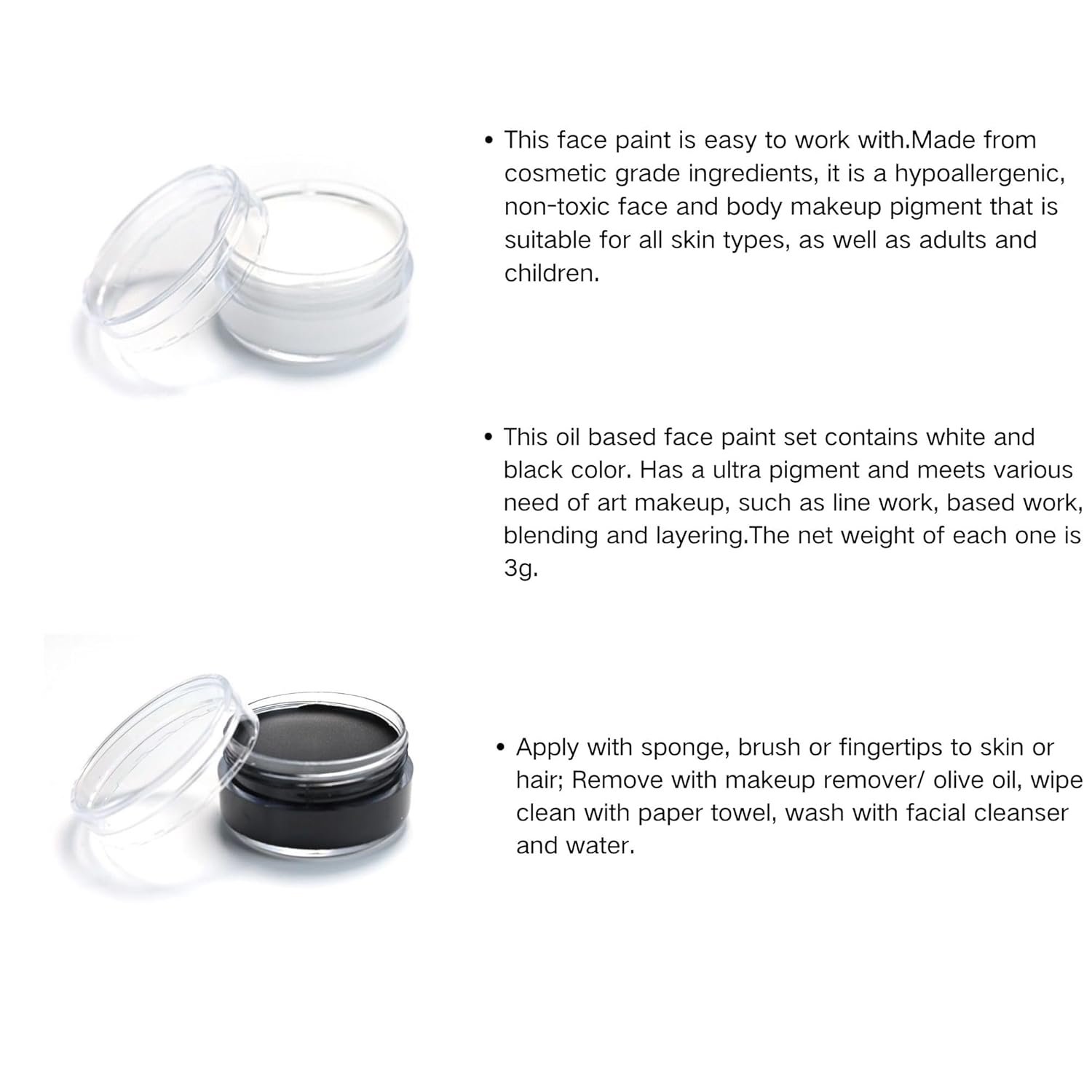 About Face painting cream:Face and body paint adopts a waterproof oil-based formula, which has a velvety texture and fits perfectly on the skin without feeling heavy or greasy. Highly pigmented color and maximum full coverage for an intense finish that stays flawless for a long time without cracking or flaking.