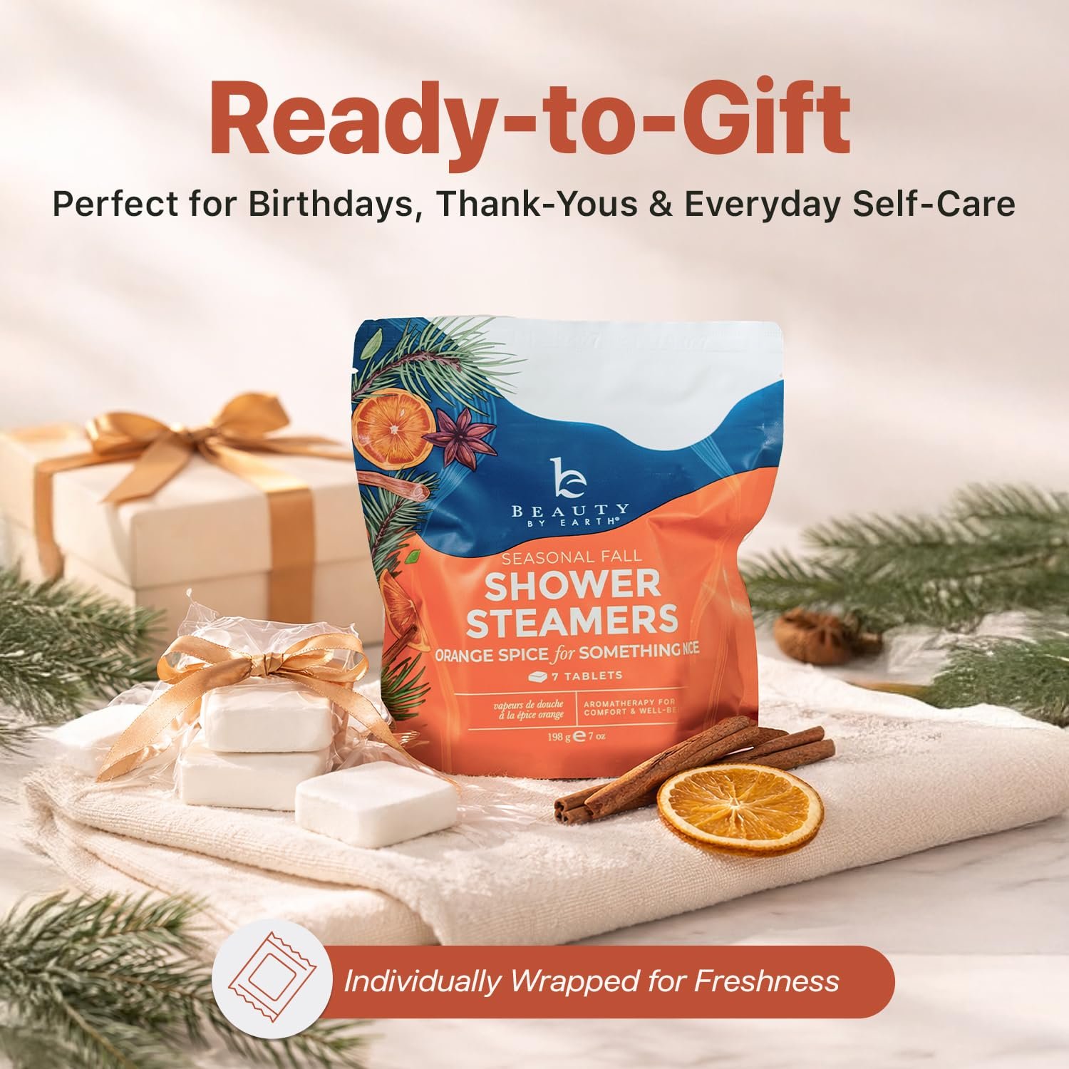 WARM & COMFORTING AROMATHERAPY: Turn your shower into a cozy fall retreat with ๐๐ซ๐จ๐ฆ๐๐ญ๐ก๐๐ซ๐๐ฉ๐ฒ ๐ฌ๐ก๐จ๐ฐ๐๐ซ ๐ฌ๐ญ๐๐๐ฆ๐๐ซ๐ฌ that release inviting notes of orange, spiced cinnamon, and fresh fir โ the perfect citrus shower steamers for seasonal comfort.